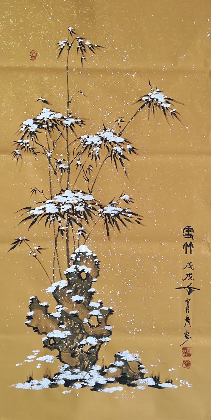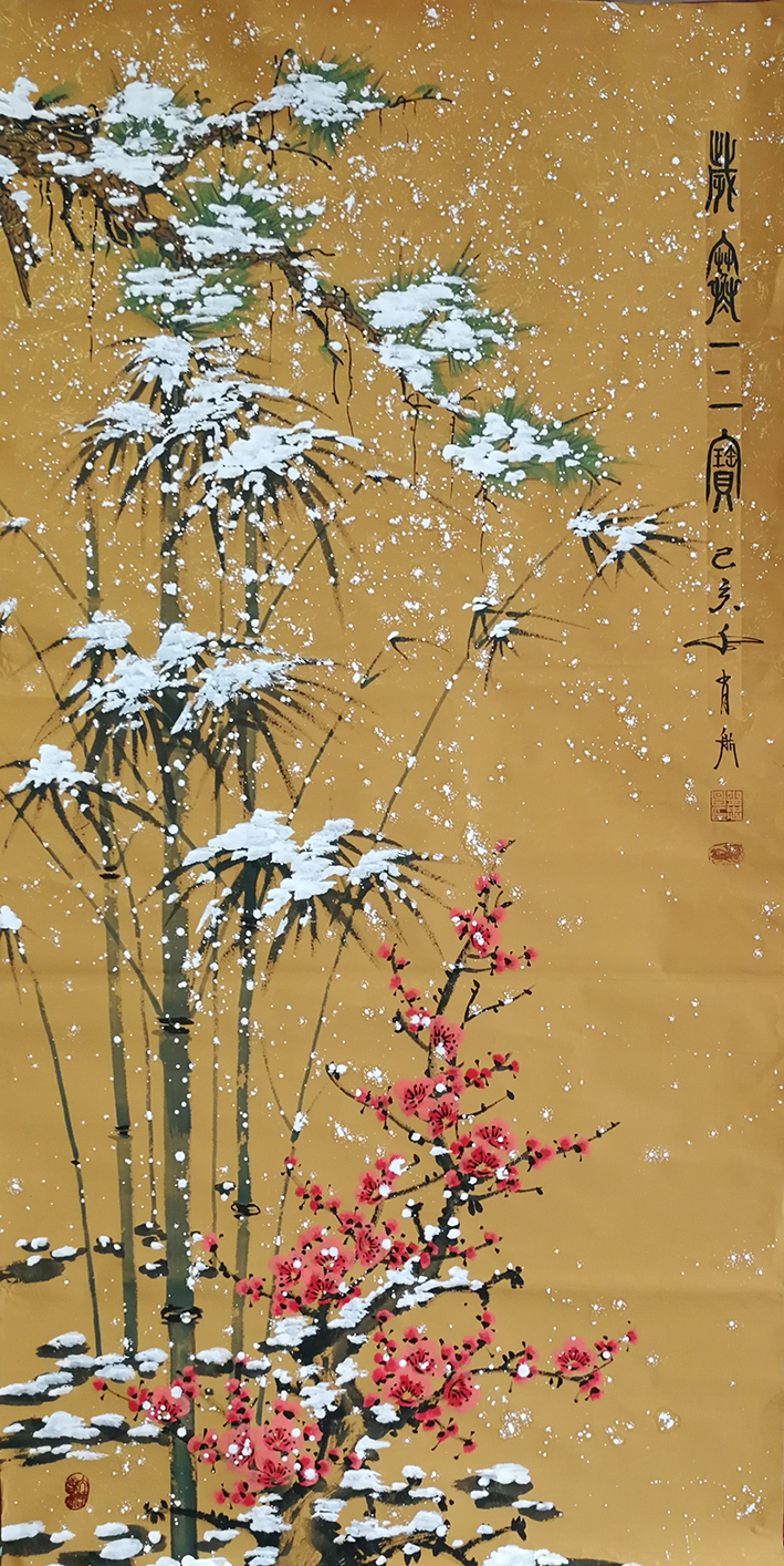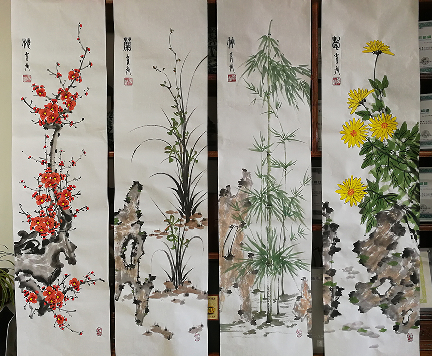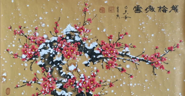 他是一位画题极为丰富的全能手,除了梅花独享一家功,竹、菊、兰、蔬也都有不俗的造诣。画竹画气节,雪映潇影。画菊画凌霜,秋韵冷馨。画兰君子雅,果蔬田园风。水墨是气韵之底,色彩是气韵之溢,色墨相益,互不害碍,淡泊秀雅,书卷馨香。崇尚典雅的丹青制韵,让他的花鸟作品大有文人雅士的审美格调,得一幅而妆厅堂,身置书馨,心修儒雅。画与心合,这是文化加持丹青创作之后的神通境界!