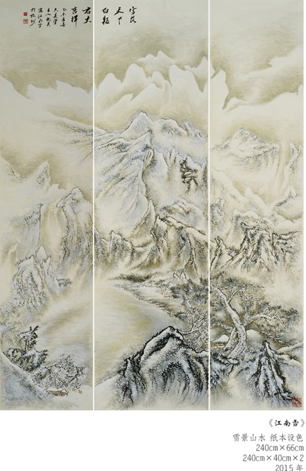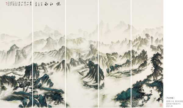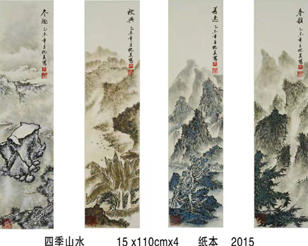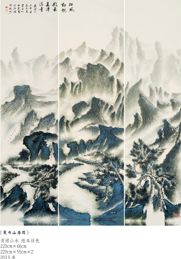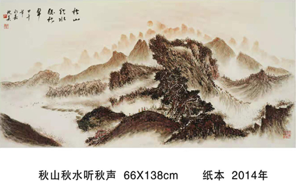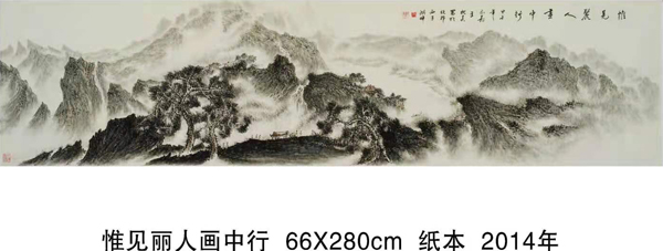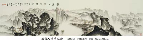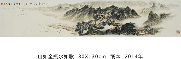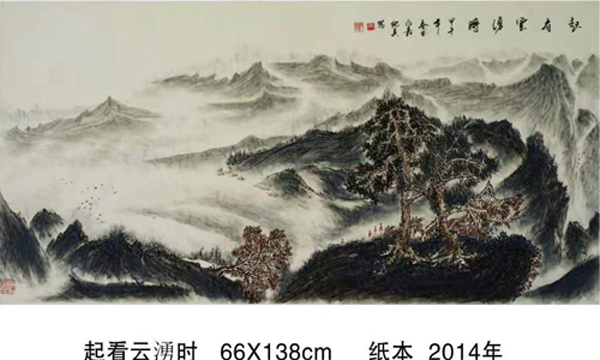 读万卷书,行万里路。他旅欧多年,深得西画艺术精微,在笔墨探索中,在水、彩、墨艺术的传统程序基楚上,典雅、自由、优雅地以诗逸化的青绿、浅绛、重彩、水墨山水给予中国山水画艺术注入了新鲜的生命感受和鲜明的时代特色,并借鉴西方现代主义和写实主义艺术融入中国传统浪漫主义倾向的绘画中得以实现,从而使他的山水画笔墨形式和艺术语言即不同于古代设色山水画、也不同于当代山水画,加上他独特的诗人气质和文人情怀,使他的作品呈现用笔精妙、用墨老辣、水墨彩交融、气势宏大又极富诗情画意的大气派。