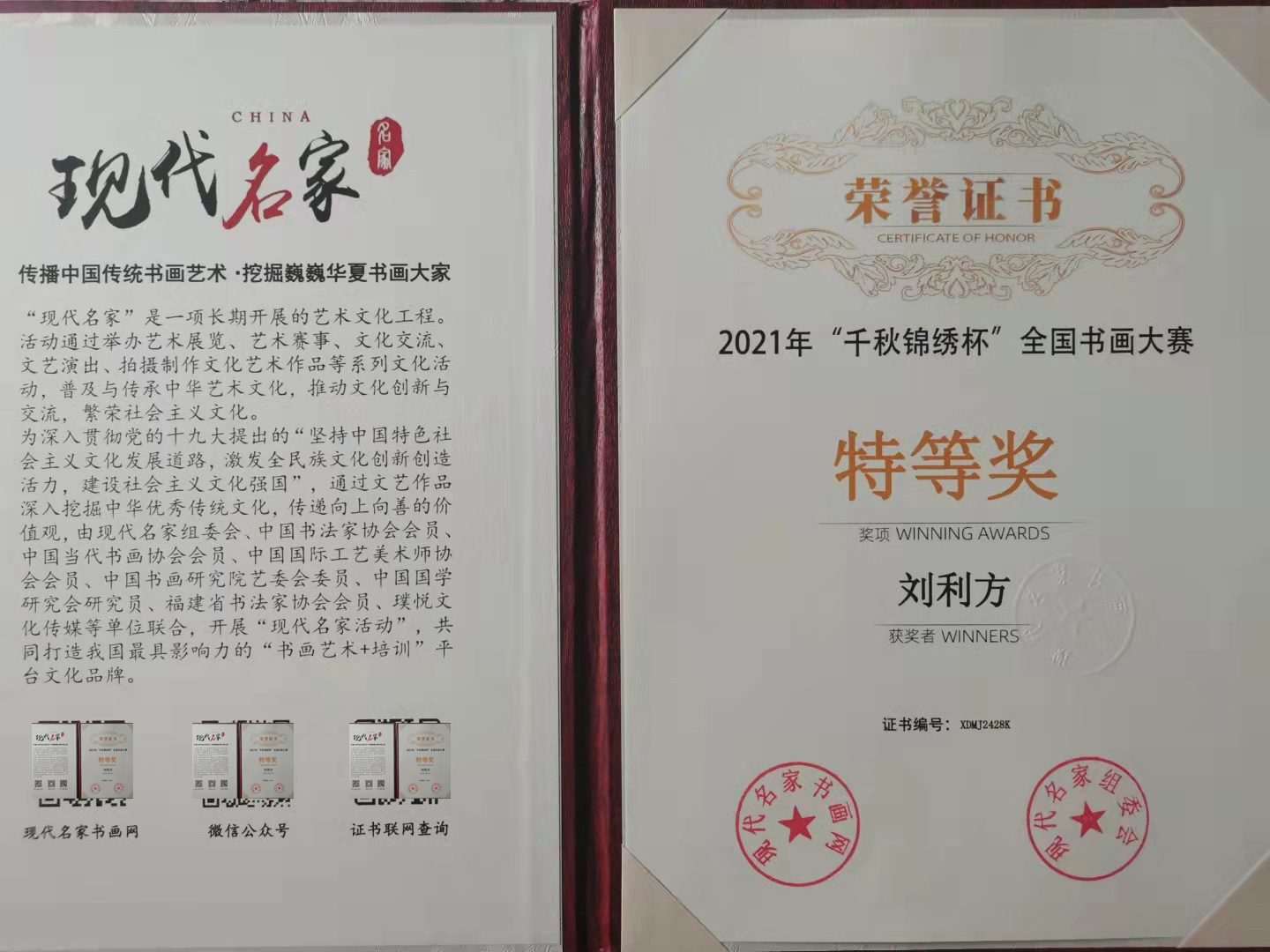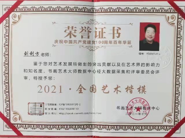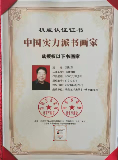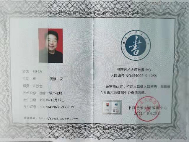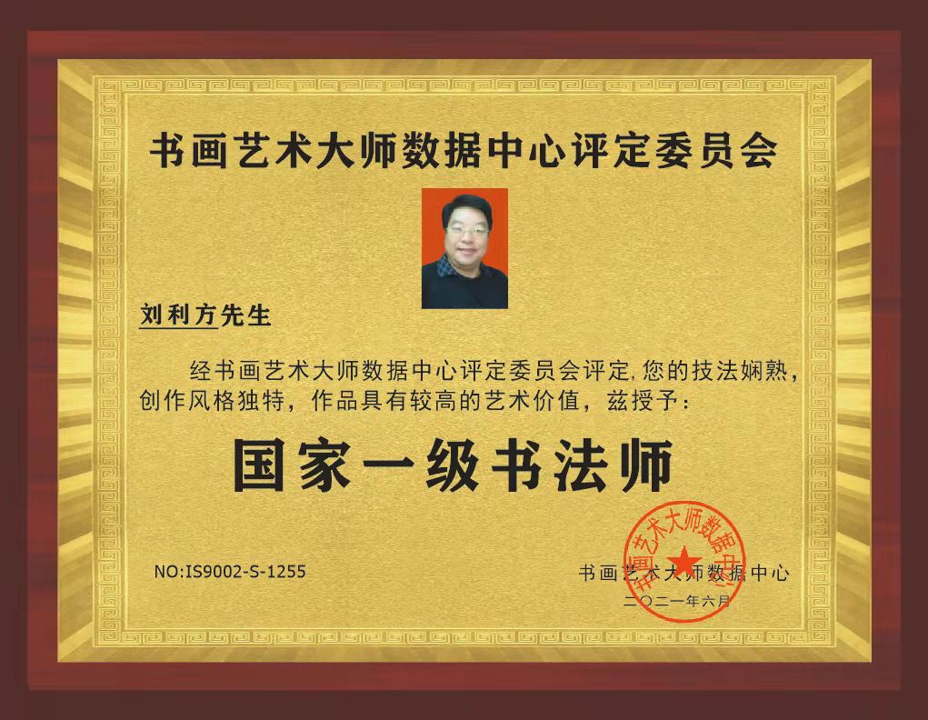 刘利方(丹青)1964年,出生于江苏省连云港市,建筑工程师,江苏省政府采购中心评审专家,数字经济参研人,自幼酷爱书画;曾多次获得全国各地书法界的不同奖项,近期1921~2021年建党100周年,荣获全国书画艺术楷模,2021年参加现代名家“千秋锦绣杯”全国书画艺术大赛,荣获第一名(特等奖);现为江苏省书法家协会会员,中国香港书法家协会会员,中国实力派书画家,国家一级书法师。刘利方老师的字,经成年累月的揣摩,砥砺出一笔笔铿锵有力、独领风骚的墨迹!其色,其形,其浓淡枯湿,其断连辗转,粗细藏露皆变数无穷,气象万千;书法里融入了儒家的坚毅,果敢和进取,也蕴涵了老、庄的虚淡,散远和沉静闲适,还往往以一种不求丰富变化,在运笔中省去尘世浮华,以求空远真味的意韵,深受大众及专家的好评,部分作品被国内外好多家机构和友人收藏。