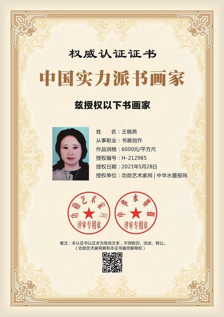 王晓燕,女,1966年7月生人。现为山东省儒学发展促进会副主任,山东名人书画研究院副院长 ,山东省书画学会鸿腾华培书画院、济南市美术家协会等多家会员。专注于花鸟、山水、人物,经常受邀参加书画活动,作品多次入选画展作品集。2020年1月入选中国艺术名人网“魅力中国推选人物”。2020年1月在书画名家艺术网“艺术中国·金属迎春”栏目展出。2020年5月入选“文化强民族强”邮册并被评为中国当代艺术名家。2020年7月入展 “第一届香港国际书画大赛”。2020年8月入选中国书画名家作品集2020年9月入选全国书画家人才库2020年11月入选书画家百科。电话15098701781