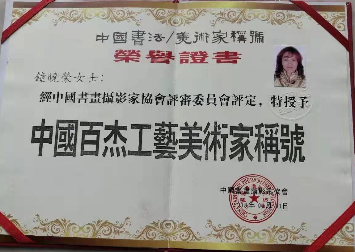 钟晓荣,中华文化艺术交流学会副秘书长,中国文化网秘书长,深圳海承文化公司l副秘书长,深圳会展中心名家书画展展厅副经理,广交会参展名家字画副秘书长,深圳金光华拍卖公司名家字画副秘书长,深圳体育馆书画展公益爱心大使,深圳书城部队书画展特邀理事,深圳社区公益活动展副秘书长,深圳一带一路全球交易中心副秘书长,中国“世界和平…"爱心大使!