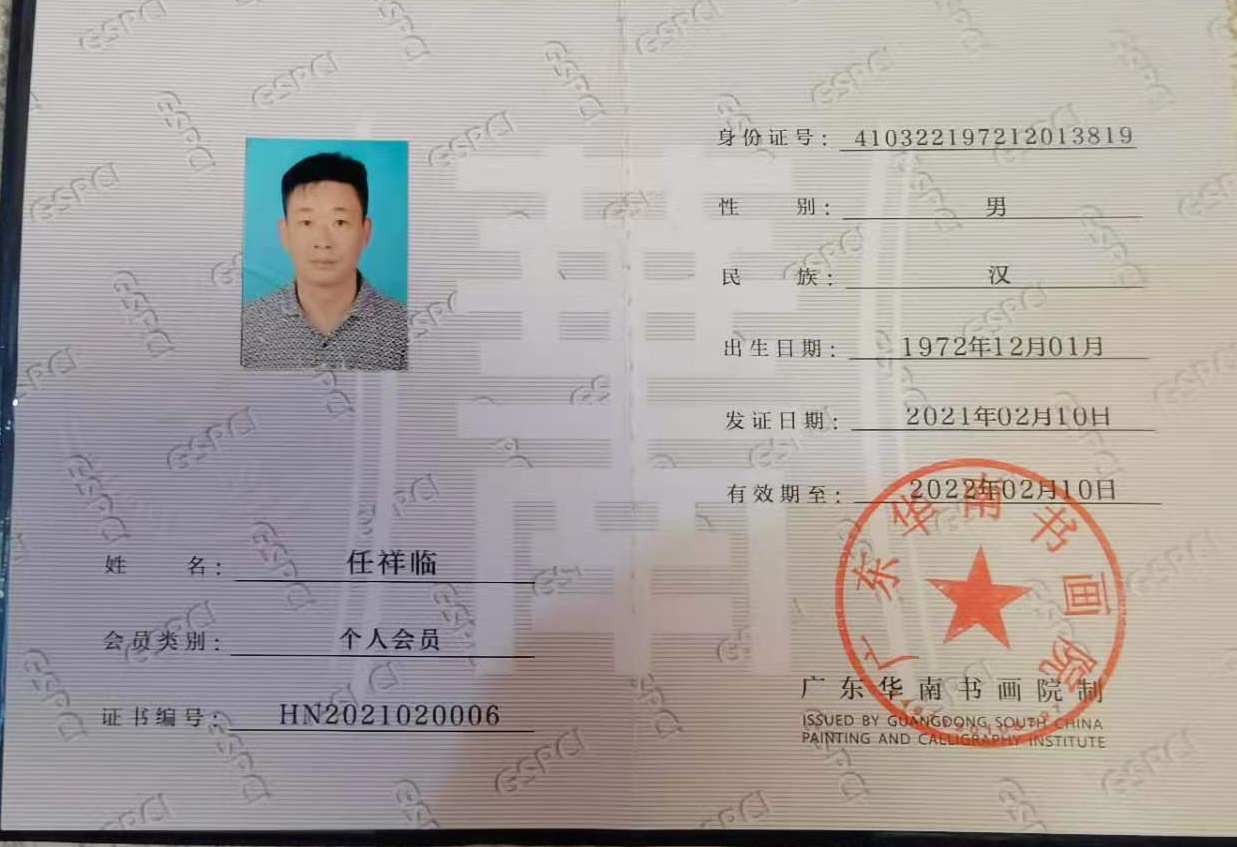 任祥临,1972年出生于河南洛阳市,93年毕业安阳职业学院,从小酷爱书法,现为北京当代翰墨文化艺术院院士,洛阳市书画家协会会员,广东华南书画院会员,在2020年度爱在中国抗击疫情主题艺术作品集上发表作品,在艺巡中华公益活动获奖,在北京当代翰墨文化艺术院中华杯获得金奖。