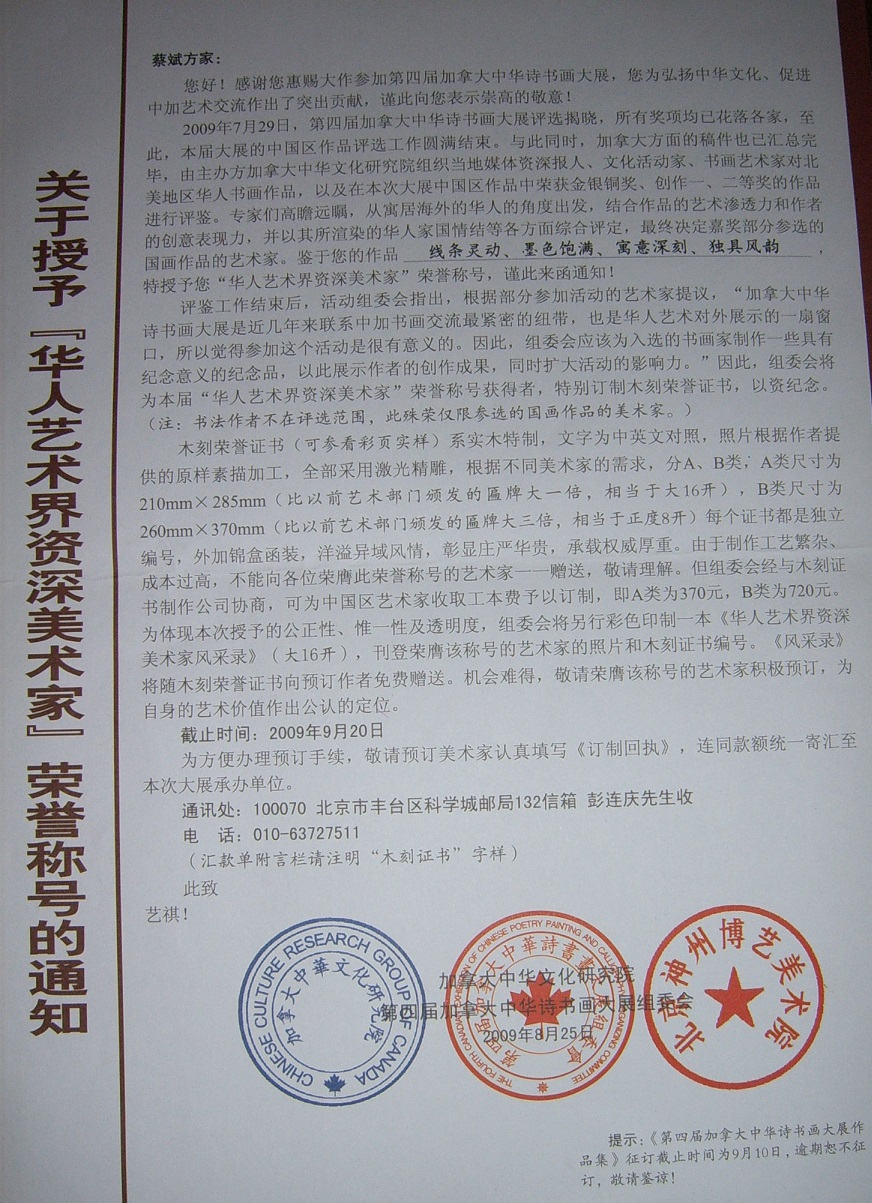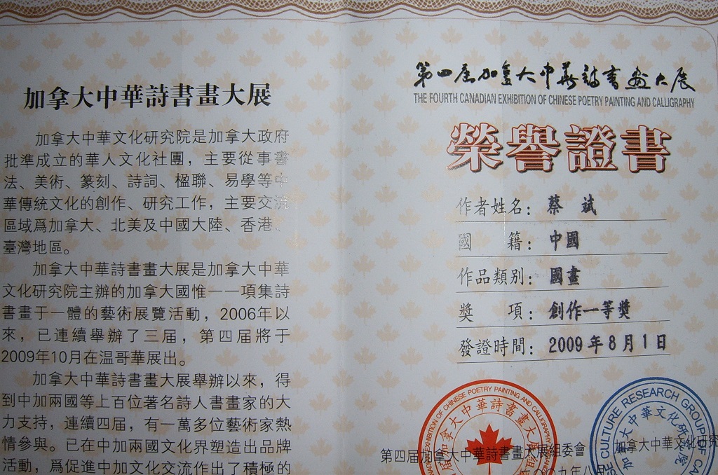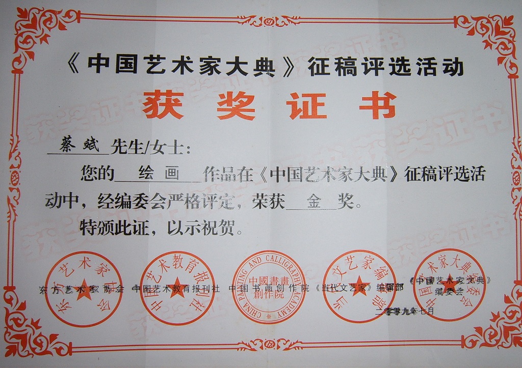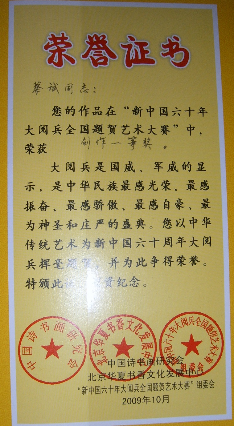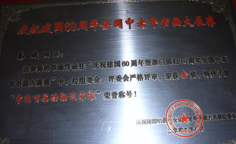 参展书画作品在庆祝建国六十周年暨澳门回归十周年全国中老年书画大赛中,因作品线条流畅、墨色饱满、寓意深刻、独具风韵荣获金奖并获得“中国百名功勋艺术家” 称号。