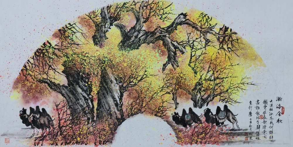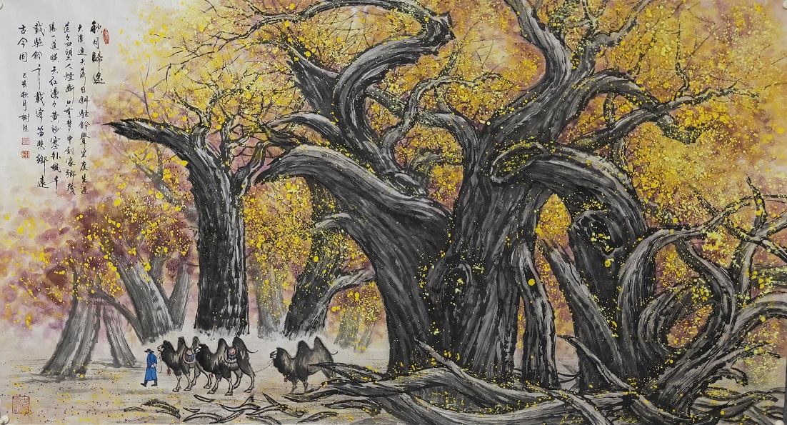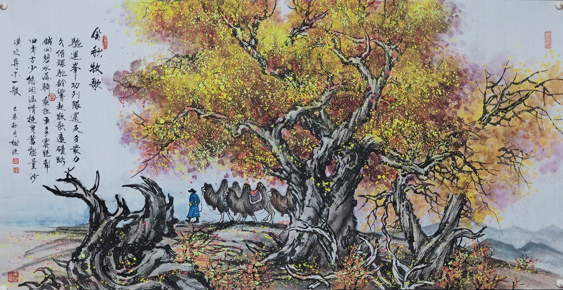 徐树臣先生穿越茫茫大漠戈壁和一望无垠的大草原,用心感悟大自然的神奇、苍古、荒凉和旷远,在大自然造化中捕捉创作灵感。塞外的辽阔草原、终年积雪的祁连山、风沙弥漫的弋壁滩,举臂苍穹的胡杨树,吃苦耐劳的骆驼,成群结队的牛羊,都是他取之不尽的创作源泉。