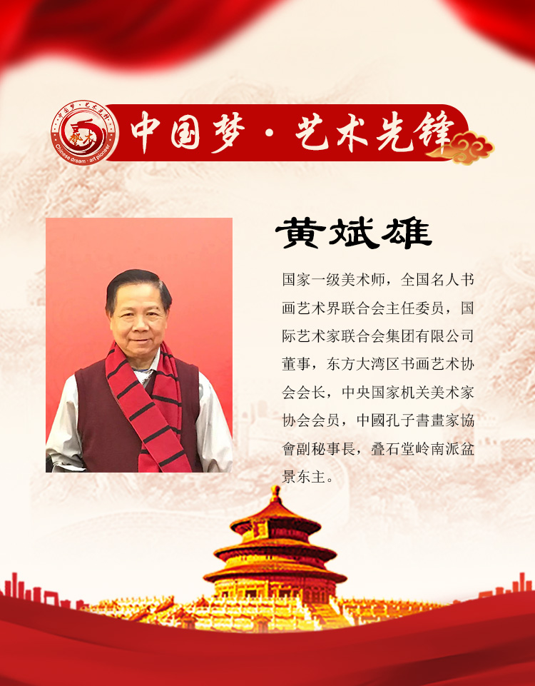 黄斌雄(志坤),男,汉族,国家一级美术师,世界华人书画家协会澳门分会主席,国际联盟书画家协会澳门主席,国际艺术家联合会主席,好品牌Haobrand品牌影响力画家,中国教育电视台《水墨丹青》書畫院常務理事,全国名人书画艺术界联合会主任委员,国际艺术家联合会集团有限公司董事,东方大湾区书画艺术协会会长,中央国家机关美术家协会会员,中國孔子書畫家協會副秘事長,叠石堂岭南派盆景东主。一九四二年出生于广州市从化街口镇。自幼喜爱绘画,同时醉心于岭南盆景,成为丹青及盆景的苦行僧及发烧友,常将绘画和盆景两种艺术的理念互动渗透。