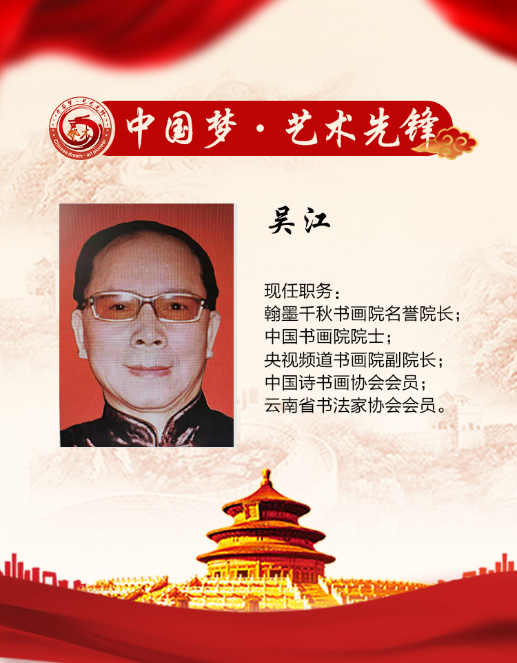 吴江,男,1939 年生,中共党员,祖籍云南。1966年毕业于云南大学物理系,大学毕业后分配到航天部中国火箭技术研究院从事科研工作。1984年调航天部直机关作技期刊编审。历任编辑部主任兼记者、总编、社长。2002年退休,返聘至2008年。现为翰墨千秋书画院名誉院长、中国书画院院士、央视频道书画院副院长、中国诗书画协会会员、云南省书法家协会会员。