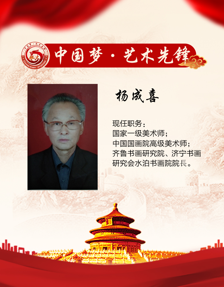 杨成喜,字,禅石,八百里水泊居士,1950年生孔孟之乡启蒙老师刘汶农先生师承著名画家王立业先生求学扵山东艺术学院得张志民、彭昭俊等大师亲传作品多次参展并收藏。 现为国家一级美术师、中国国画院高级美术师齐鲁书画研究院、济宁书画研究会水泊书画院院長。