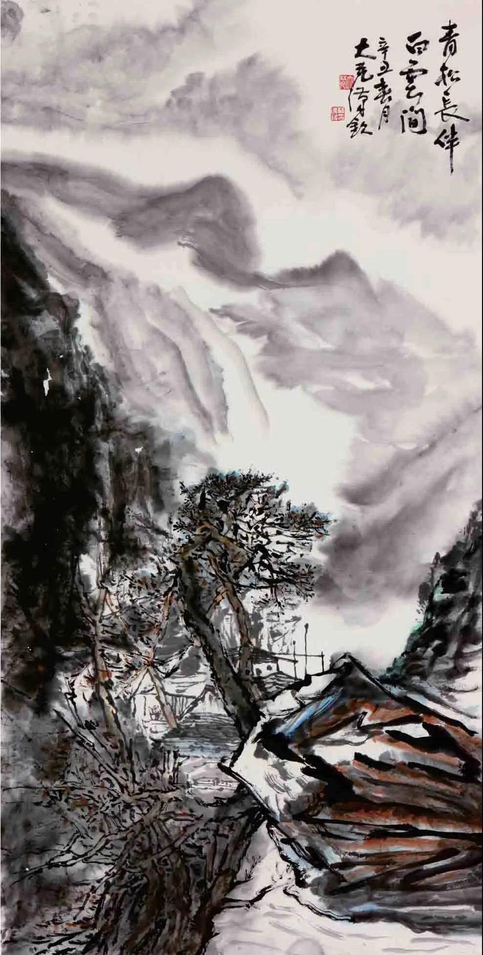 国画《青松长伴白云间》