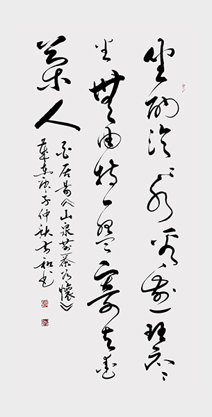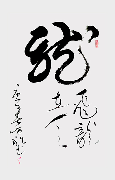 而在草书作品中,先生则是尽显一种恣意流转的笔势理念。行笔运笔,犹如枯木走蛇,龙飞凤舞,每一个字都是将先生的技法功底展现的淋漓尽致。一幅念奴娇·赤壁怀古书法,放眼观之,只觉豪情万分,引人入胜,创作中字字变化万千,时似高峰云巅,气吞四方,时似飞箭瞬息,锋芒独彰!