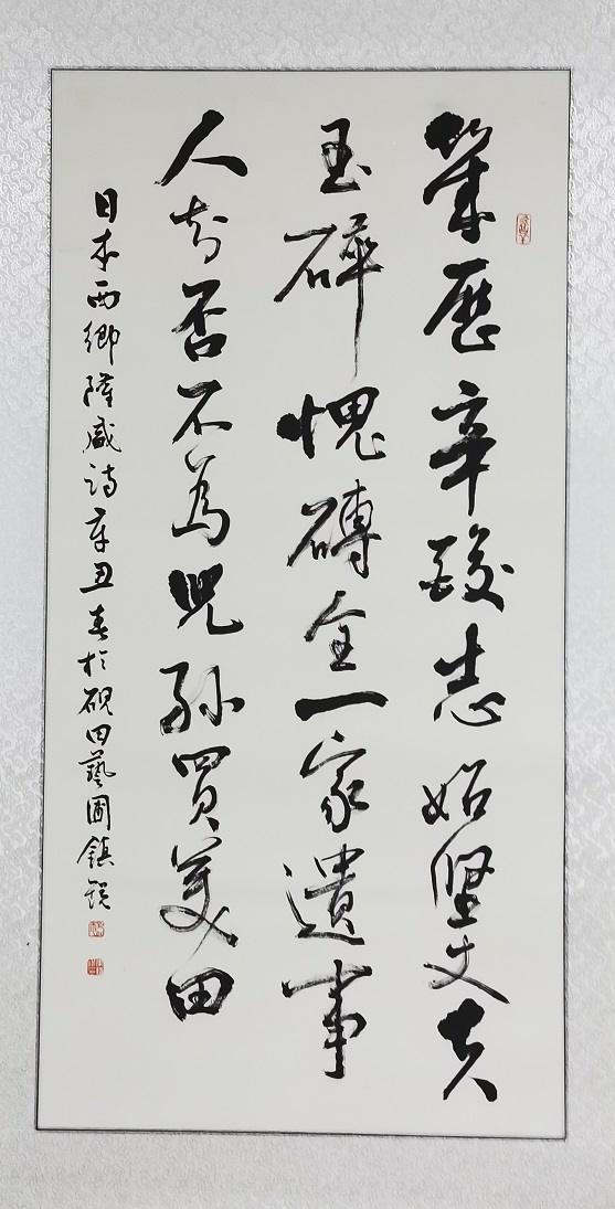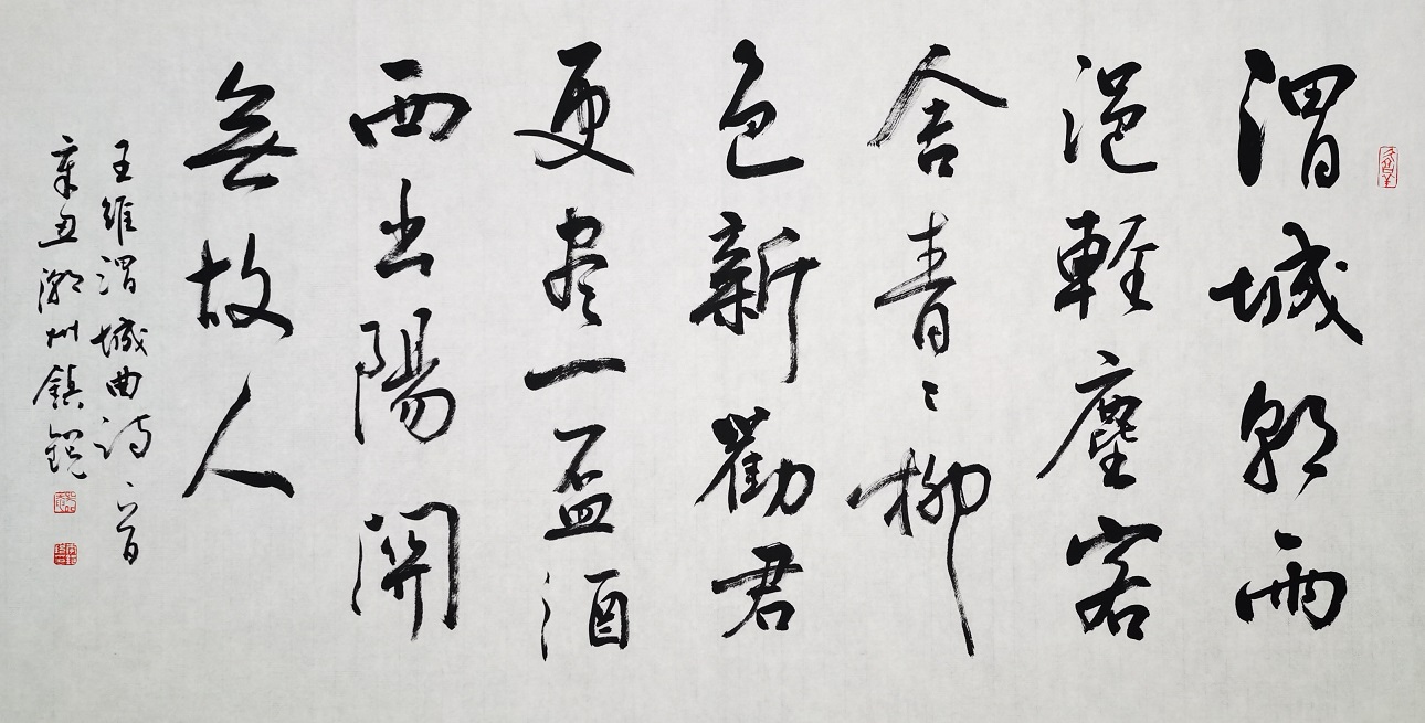 李镇锐先生又系统地研习米芾刷字风范,也琢磨赵松雪笔下的天质自然,执笔在于手,运笔在心,再参意孙过庭草书的徐疾节奏和王铎书法从饱墨淋漓写到枯墨浩莽的独特,一一精研,不遗余力。凡书圣草圣所涉及的鱼笺素绢,皆临习到默于心透于笔,可以化他法为我法,不作书奴,亦非书匠,在上下挥洒一笔书的表达中,体现着古瘦淋漓半无墨,志在出新无定则的书道新奇!他把行草的速度与力度控制的精确而和谐,快如惊雷驰电,慢如激楚浪以成文!或重若崩云,或轻如蝉翼!写出来的行草作品类万物之状,果然是同自然之妙有,非力运所能成!师而不拘,法而不泥。李镇锐的书法可以借古开今,自立面目,尽有笔墨当随时代的精气神!