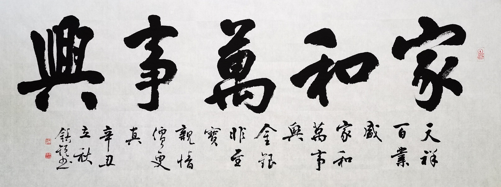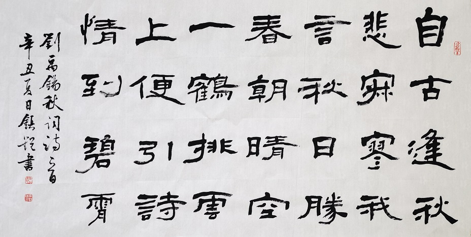 楷精法详,功在出新。从书法的宽度上来看,李先生还善作篆隶。篆书取法泰山碑,写得饱满圆厚,刚柔相济。隶书以曹全碑、礼器碑为法本,写左掠右挑丰姿多神,既有汉隶的风范,也有汉隶的风度。由是,纵揽李镇锐书法非凡的宽度与深度,必有诸书皆成、博涉多优的定论!