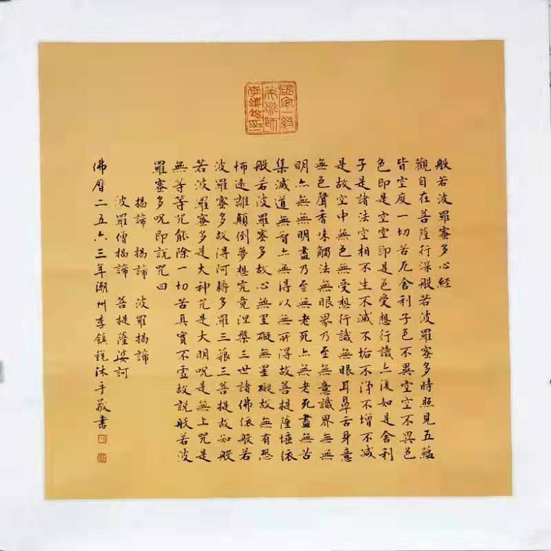 常言有论“楷法无欺”,一位书法家功底的扎实与否、法度习成的成就品质,事实上把楷书一摆立见高低。当代书坛略过或绕开楷书习成者比比皆是,这明显拉低了书法创作的法度水准。但是反观李镇锐先生的楷书作品,立觉万分折服,最有法不欺人、功不欺世的真功夫。他小楷抄心经,心无挂碍,笔通般若,写得明心见性,可以澄怀悟证!其楷书系统地梳理了魏晋小楷的圆活生动,也重点参意了唐楷的精益求精。宣示表的抑左扬右有之,九成宫的用笔险绝有之,颜筋柳骨有之,赵子昂飞仪写透重修三门记的洒脱劲儿有之!所以,取法多元,又能融会贯通,把楷书写得结体严谨,笔墨臻密。显观正大气象,可证翰墨精研!