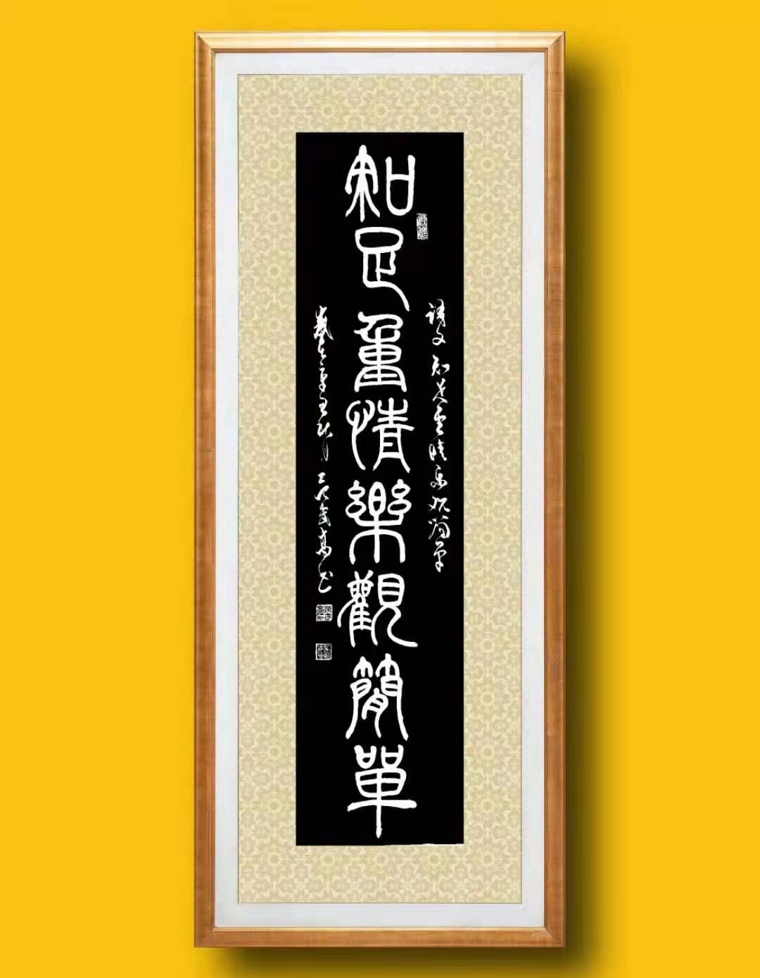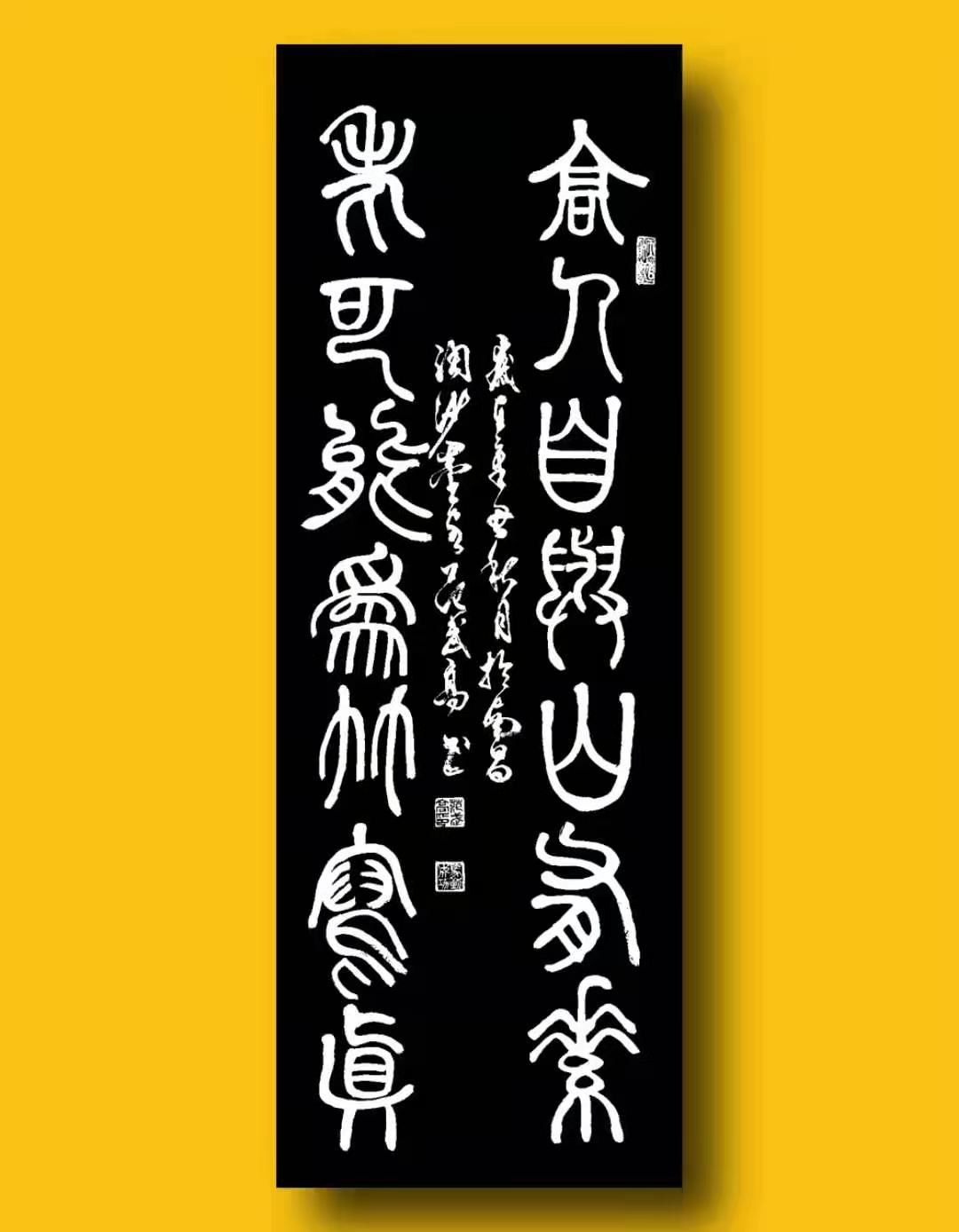 篆书的创作最重结构和学识,结构不精,则字形失态,学识不深,则无以作字。而范武高先生之所以能修得篆体高境,正是因为他深谙篆体的创作结构,同时更是因为他那深厚的学识修养。其篆书结体严谨,字字可察可据,虽有个人变通,但仍不失古质风韵!线条时如垂针之露,上下畅连,时入古道骏马,婉转挺拔。字体与字形之间,皆是疏密得当,密处不透风,疏出可出锋,疏密相对,奇趣乃出,如此安能不彰妙也!