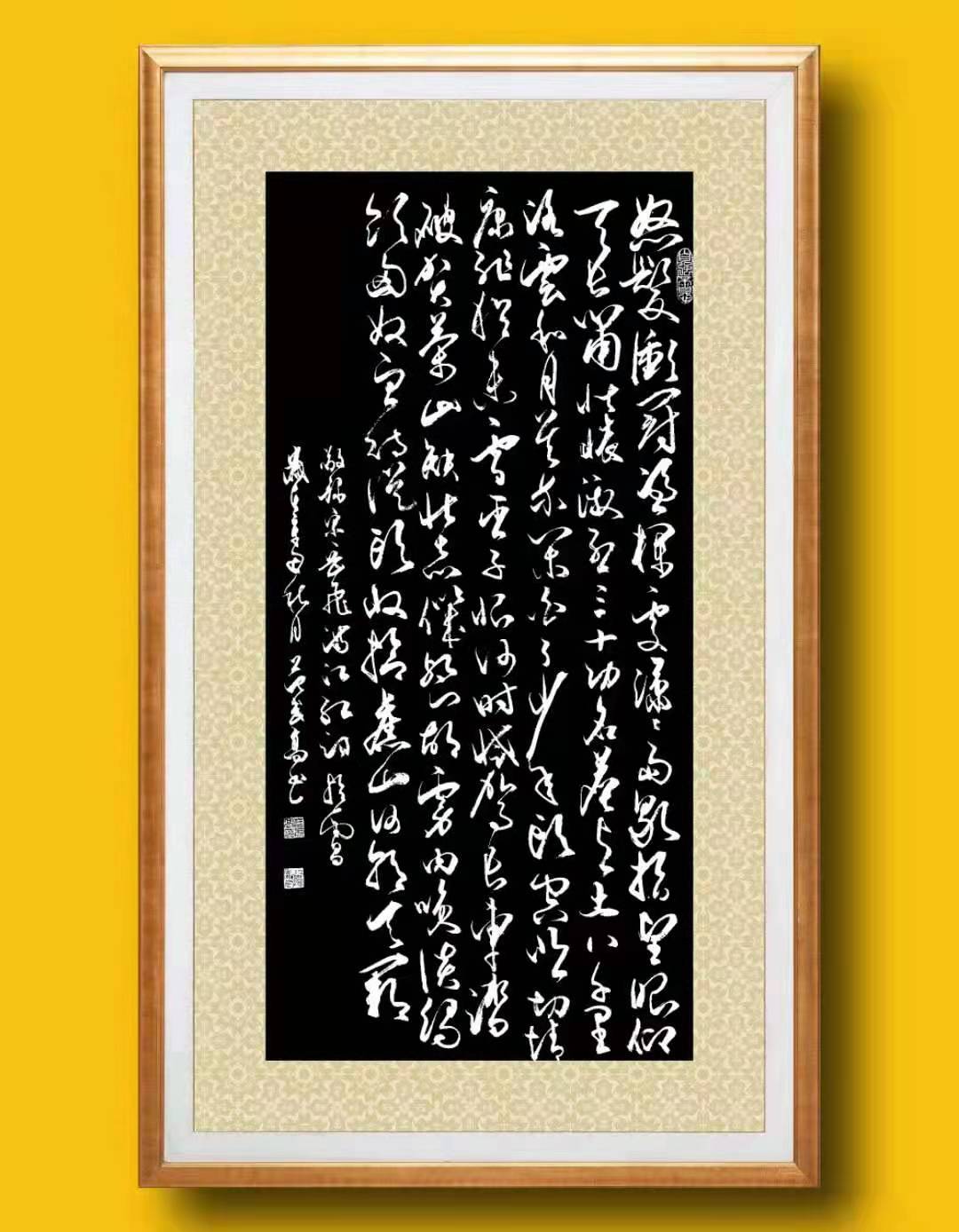 先生作草,可见米芾之纵横,亦可见怀素之狂放,笔法急速飞驰,酣畅淋漓,似龙蛇之行,更似奔雷之彻!观者读之,全然心浸于其间。不得不说,范武高先生所展现出的草书境界,绝对是脱俗入道的,神与笔相来往,墨与心相辉映,他让自身的精神回归于草意,让自身的心境回归于笔墨,又以最大的功力去深析草体的艺术本源!这些宣纸上的笔墨挥毫,是先生的心性解放,更是他对草体书法的真挚感情……
