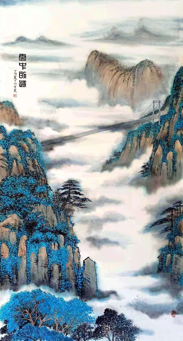 在整体结构方面,代女士并没有局限于单一的阁楼缓峰,而是更偏向于描绘南方的一些高逸峰峦,尤其是在作品的布局上,代女士更是展现出了一种全新的心境布局和画面突破!画中山川,险绝林立,气象丛生,远观可至深,近观可至雅,加之画中那大青绿的艺术主调,整幅作品则更显壮丽之奇绝!高度的墨色融 合、明逸的布局结构,众幅作品实无愧于大家名誉!奇峰罗列。锦绣山河。