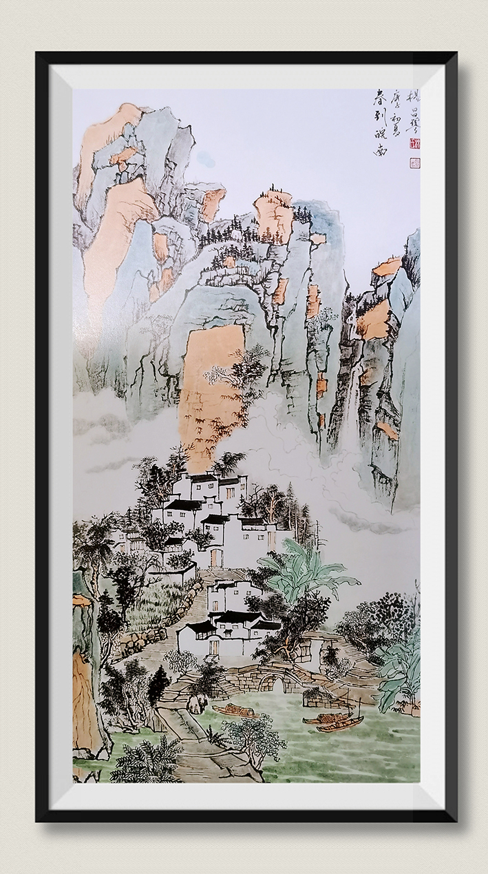 南朝著名画家宋炳曾在《画山水序》中有言,其曰:“圣人含道映物,贤者澄怀味象”。可以说,这种极具深意的文人精神和理念,是对个人的丹青艺术发展起到了关键性的助推作用。今杨昌琴女士作画,正是深谙于此道!得益于这种精神境界上的契合,杨女士的山水画也是找到了传统青绿的真谛所在。在画中,她的不仅夯实了传统的笔墨法门,更是找到了传统和现代笔墨的融合点,使自身的青绿山水展现出了一种全新的个人面貌和发展方向!笔墨层次分明丰富,构图设色开合淋漓,景致清逸而画风悠然!此实为当今青绿山水之硬功,有别俗笔,自称大气!