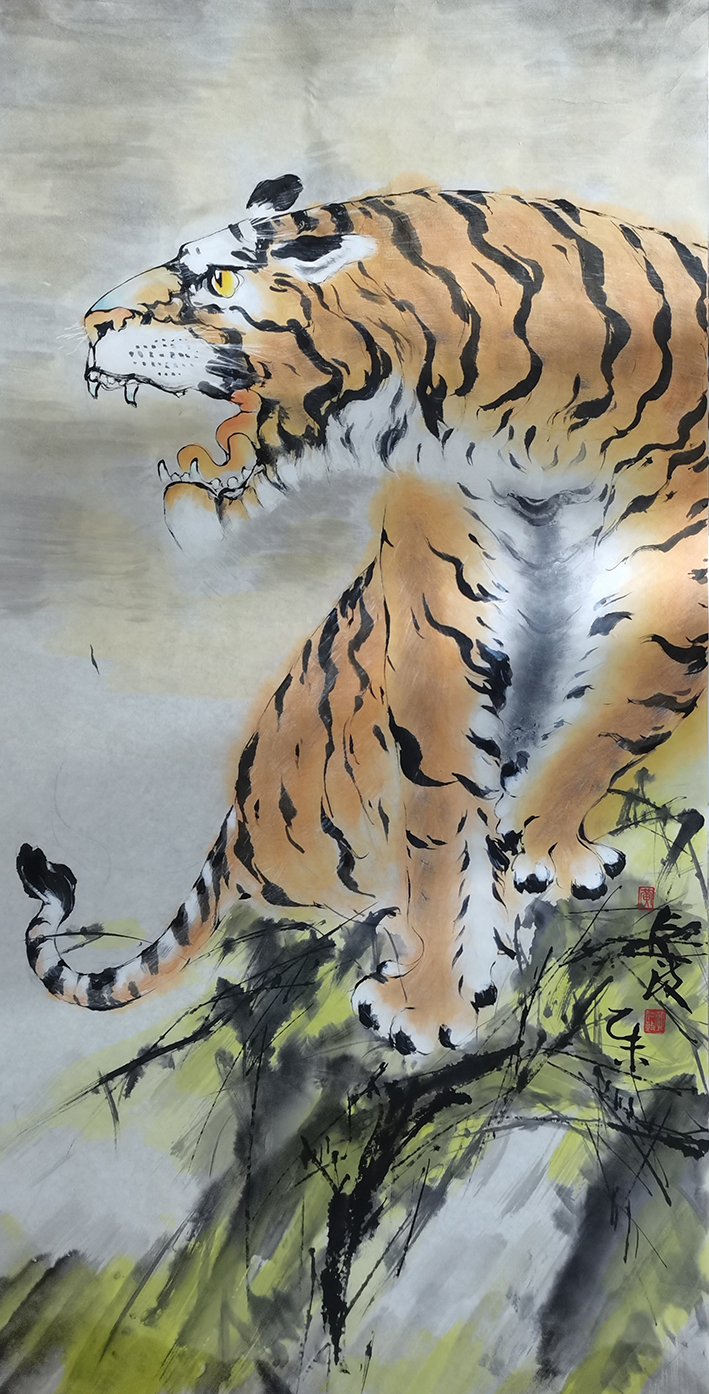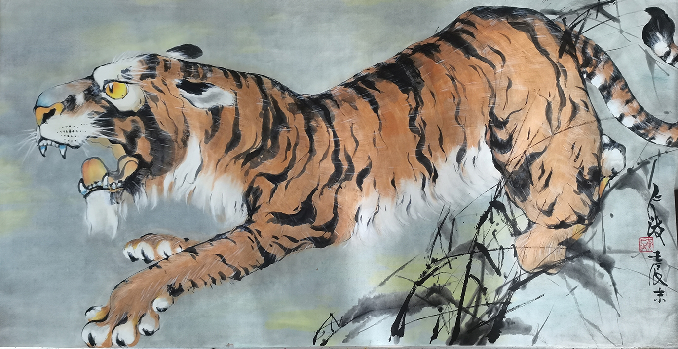 若想画好一幅猛虎作品,画家就必须深谙虎之结构,尤其要是对猛虎的动静状态和骨躯有深厚的理解度和个人体悟!不仅如此,历代画虎名家所留下的臻品范本,对当今画家而言也是具有很高的临鉴价值和学习意义。今黄仁政先生作虎,正是深谙于此些法门。在创作上,他不仅充分领悟了传统的画虎要诀,对虎的真实形态也是多有实临实感!