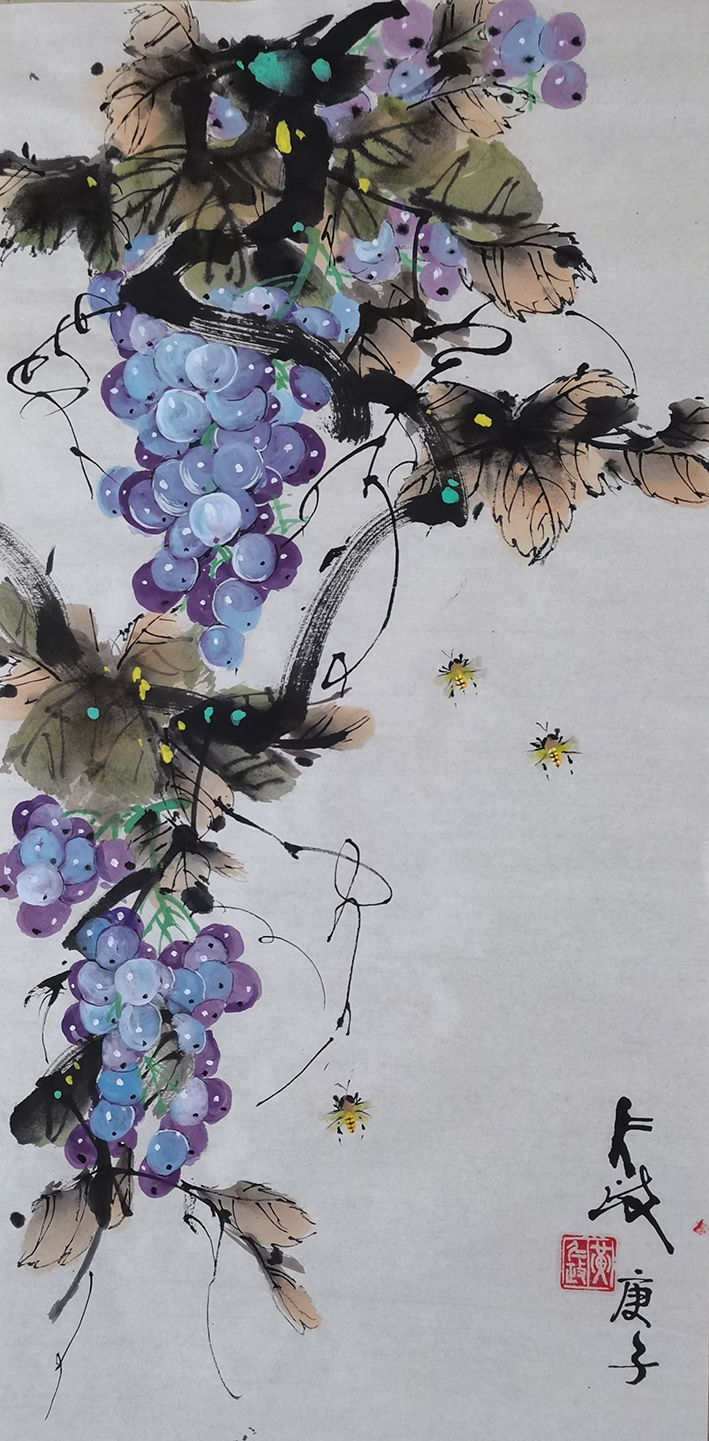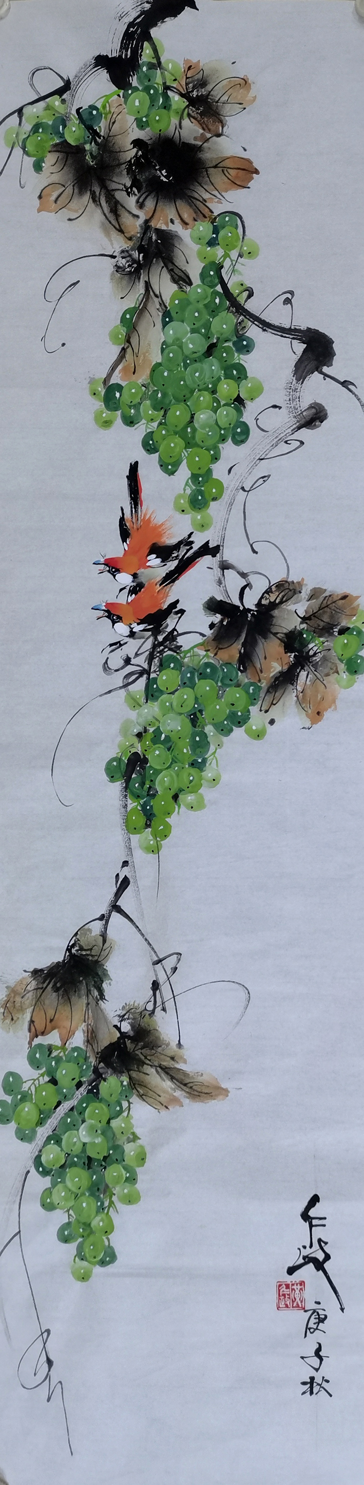 在花鸟艺术题材上,先生则不与猛虎之意相近,而是使众幅花鸟作品转向了清逸和雅的一面。其画中牡丹,设色贵艳却不失清润,用意大雅却不流俗风,实为雅俗共赏,意趣盎然!绿葡之作,设色更是渲染恰当,葡萄脉络有筋有饶,画中再绘以鸟禽两三相伴,则更有一种“桃红复含宿雨,柳绿更带朝烟”的诗情意感!美轮美奂,尤静心神!