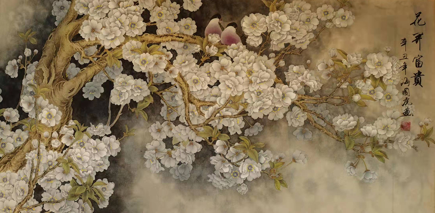 系统的研习,加之海国虎谨细的心神和认真的态度,让他很快就领悟到了学研之核要,他秉承严守传统之步伐,沉心潜性,心无旁骛,深索古法精妙。他深知,这个学习的过程,犹如树之扎根,越是沉潜则愈发根深蒂固,才能为将来的枝繁叶茂打下坚实基础。“学习书画,临摹是必须的功课,对古人技法的揣摩和掌握,对古画气韵的感受和呈现都要做到宏观和微观上的读解。这是必经之路,不能逾越,更不能有丝毫懈怠。传承的功课做得越好,支撑创新的底蕴就越深厚。”