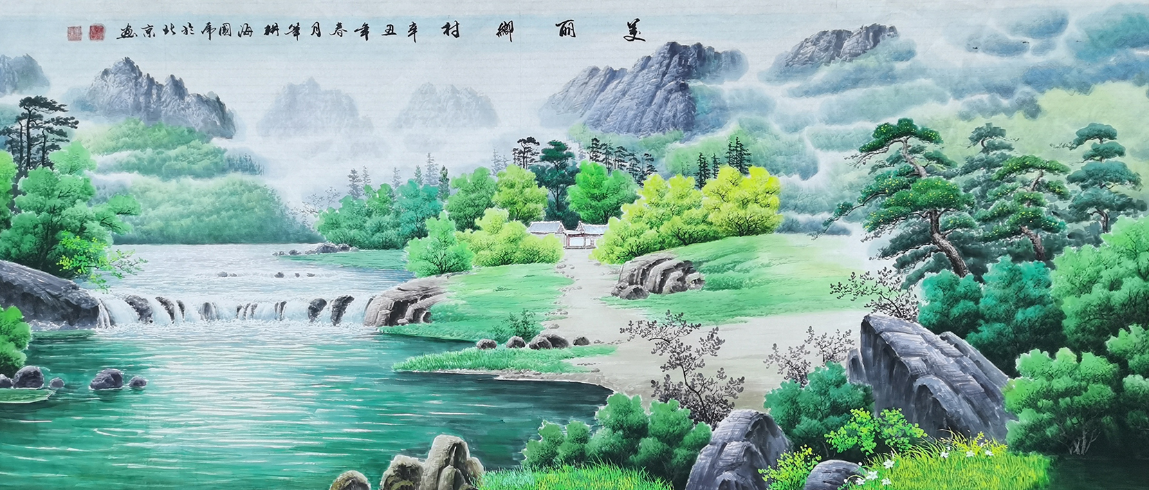 在这个问题上,海国虎先生的选择却是与众不同的,他的选择甚至可以说是极具典范性的。在画中,先生的笔墨是探悟到了自然的山水本色,尤其是在表现手法上,他更是将笔墨根基在了山水的自然姿色上,使山水呈现出了一种蓬勃向上的艺术生命力!纵观众幅山水,其作中可叹山峦之叠秀,亦可仰白云之风起,整幅构图甚至是完全超越了笔墨的拘束,无论是山石还是绿林,亦或溪流横沟,皆是在这一片祥和宁静的山水世界中趋于了一致!天朗气清,惠风和畅,师法自然,雅俗共赏!