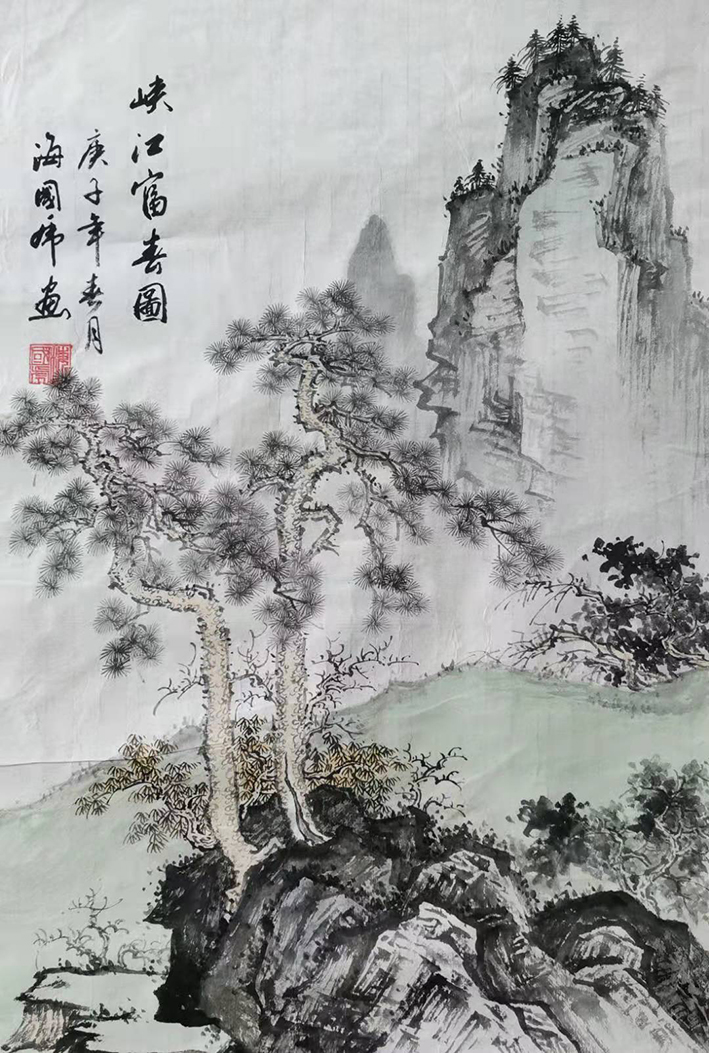 海先生平日极好山川之游。几十年来,他的足迹早已踏遍祖国的名山大川,早已经纳万物于胸积淀下丰富素材。他认为,笔墨是有限的,而自然物象是无穷而博大的,只有在经历了“搜尽奇峰打草稿”的千山之阅,才能为创作出丰富灵动,充满生命力的作品提供源源不断的灵思之泉。