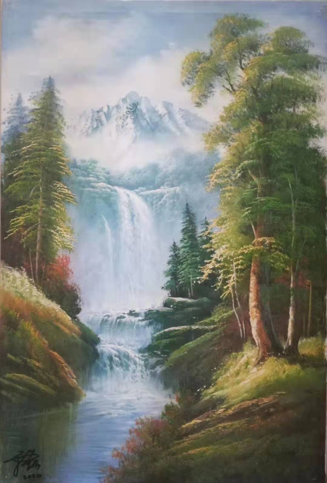 大自然的基本色是他追随的色调。他将西画的一些表现理念融入国画的创作中,笔下全然天地缤纷大道于胸。在构图上,画以“力”取胜,以重为形,但能让整个画风,密集而能透气,营造出一种“乱峦迷人眼”的古典意象,给人以一种强烈的原始自然美的视觉冲击力。在题材上,他既致力于写意小品,又钟情于工笔花鸟人物,尤潜心于水墨山水画的突破,西画与中画的结合。