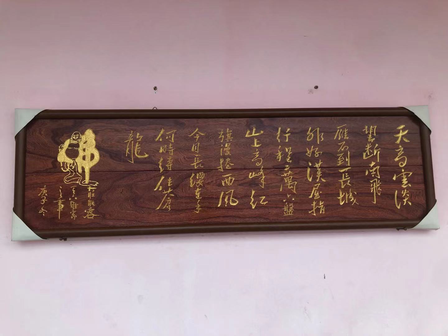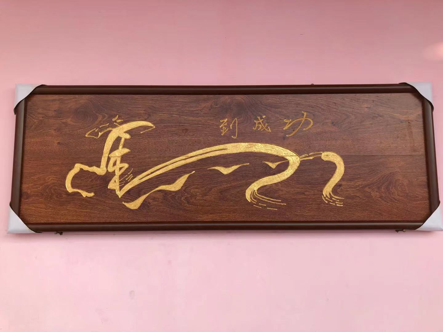 郎先生的匾额制作既有古法的古典精神,也有切意当代家居文化的时尚气息。高古而不呆板,时尚不作肤浅,书丹卓越,可以作出锋须往来、高低有趣的底色。雕刻精细,落刀沉着,行刀飞仪,可以最有效地保留书法的惟妙,同时可以突出经由刀刻而显成的正大风骨!由是,在妙书精刻的保证下,再涂以金典正色,让他的匾额创作拥有超脱于匠工的品质,赢得了艺术奇观式的新辉煌。这是他把匾额作品由技术升华为可以统摄人心之艺术的重要原因。技达高处称为巧,艺到臻时是谓妙。郎先生书刻金匾,巧妙兼成,是家居的上品,也是文化的杰作。一匾万金,文化无量!