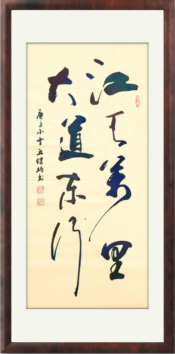 再观先生行草,其行草风格尤视变化之多端。作中笔法恣意放纵,行笔时如破阵之马,急行迅速,时又如龙蛇奔走,蜿蜒曲折!笔笔线条可见颠张之淋漓,又可见狂素之痛快,字线穿插之间更是独彰百家之余韵,是谓取法众多,妙合自然!细赏全幅行草,尽可叹悬针垂露之绝境,更可叹奔雷坠石之奇势,一个个行草字体,可称是与古人精神相往来,亦是与传统法度相谙合,读来实可觉魂魄不凡,荡气回肠!