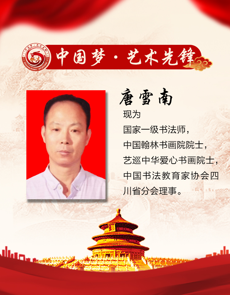 唐雪南,笔名:墨藝,字南人。江苏省无锡市宜兴人,毕业于“中国书法函授学院”本科,国家一级书法师,中国翰林书画院院士,艺巡中华爱心书画院士,中国书法教育家协会四川省分会理事。《弘扬艺术·德艺双馨》艺术家,中华艺术人物,当代最具收藏价值艺术家。