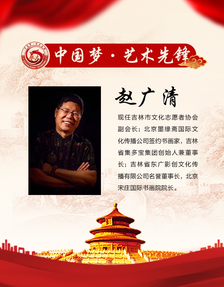 赵广清,字山泉,名清水,号东方迁森,男,1957年5月生于吉林,赵氏烫画第四代非遗传承人,现任吉林市文化志愿者协会副会长;北京墨缘斋国际文化传播公司签约书画家,吉林省集多宝集团创始人兼董事长;吉林省东广影创文化传播有限公司名誉董事长,北京宋庄国际书画院院长,吉林科学艺术教育企业家沙龙会馆馆长;中国教育电视台《水墨丹青》《名家讲堂》签约艺术家。
