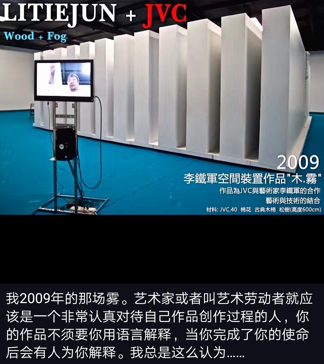 人生与世界很复杂,复杂的成为一团雾。人生与世界如此简单,简单成一团雾!李铁军的艺术效果,无疑问是哲学的、机格的、理性的、辨证的,所以能够让所有人在“雾”的主题里适性切意,终有般若。这不是简单的行为艺术,而是用由行为、装置、文献、视频一并构成的美术哲学!是洗礼脑海的伟大气场!