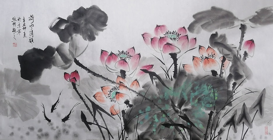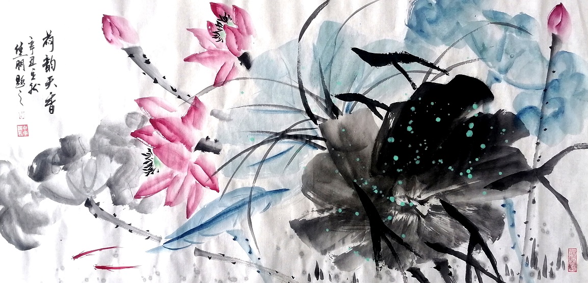 中国画讲究水墨色彩渲染而成的意象。意象非实像,亦非抽象。实像看得太透,抽象看不太懂,意象是介入实像与抽象之间的心觉印象,不必言释,明了透彻!这种源于心与自然相融而成的意象,事实上就是东方审美的神与韵!画家焦朋写意荷花,最善于创作一池禅荷听风雨的神韵,起笔落笔以文化为品位,笔画墨绘以心灵印象为表达,画出来的作品自然极富东方审美的气韵生动!