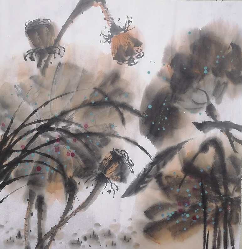 谢赫论画,有气韵生动的首倡。观鉴焦朋荷花,画风清许,画品优雅,绝对都是一天清淑气,万里碧榆风的气韵生动。画荷花有气韵,一是源于水墨的纤尘不染,二是来源于色不碍墨的渲染。水墨相调,以水为道,以墨为器,作出淡浓湿干焦五色焕神。不因淡而伤神,不因焦而滞笔,大墨苍润,淡墨氤氲。可以积墨以达铁铸之质,可以破墨以成玄妙之意。再有浅绛染荷花,就是苍润里点娇艳,艳而不俗的独特气韵!由是,看他的荷花作品,最适于明心见性。不恐秋风早,荷落诉哲思!遥望这一池的荷花,可证天地之悠悠,不生不灭!哲学味道,佛家义理,都醮在笔墨里,妙作圆影,当然是随类赋彩而成的气韵生动!