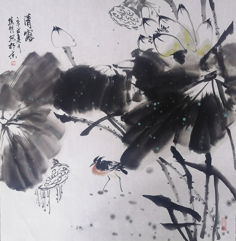 圆影华池,曲岸浮香。焦朋的荷花,在空间的经营上,有着高低有趣,虚实相生的安排与陈置。水作留白证空,花作一拈无言。画荷是画荷,正宗的技法摆在眼前。画荷非画荷,名为画荷,实为自证!不住色声香味触法,笔墨离六尘,一笔一菩提,一画一如来!凡所有画荷者,能像焦鹏这样把荷花画出真妙禅味的贤达实属稀有鲜见。所以看他画的荷花,常有这样的感念:荷寓修行,亦证觉悟。无畏一夜风吹雨打,笔墨愿泊浮香曲岸!