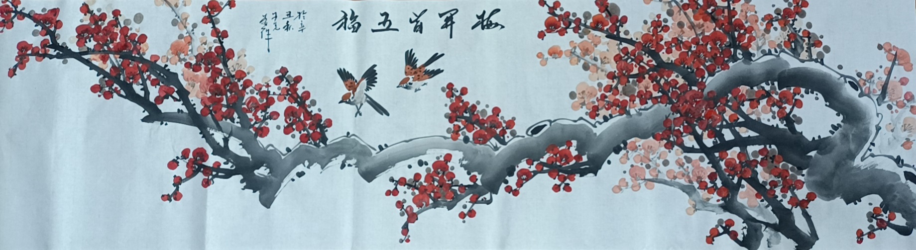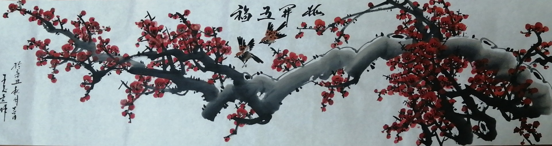 在梅花丹青的创作上,王志远先生则是更善于表现文人格调!在笔法上,先生是突破了传统梅花的小雅氛围,转而是以气势宏博的大家风气为主调,笔构梅形,具细致之脉络,更具潇洒之磅礴,运笔时而硬如铁戟,时而柔如棉丝,通幅笔法实可谓刚柔相济,相辅相成也!画中所绘梅枝,主干遒健似苍龙,正气凛然,枝干曲意似蟒蛇,饶有变意,红梅赋之于其中,更是大有文人风骨之感!全幅可叹凝而不泥,腾而不浮,高古致雅,意境不凡!