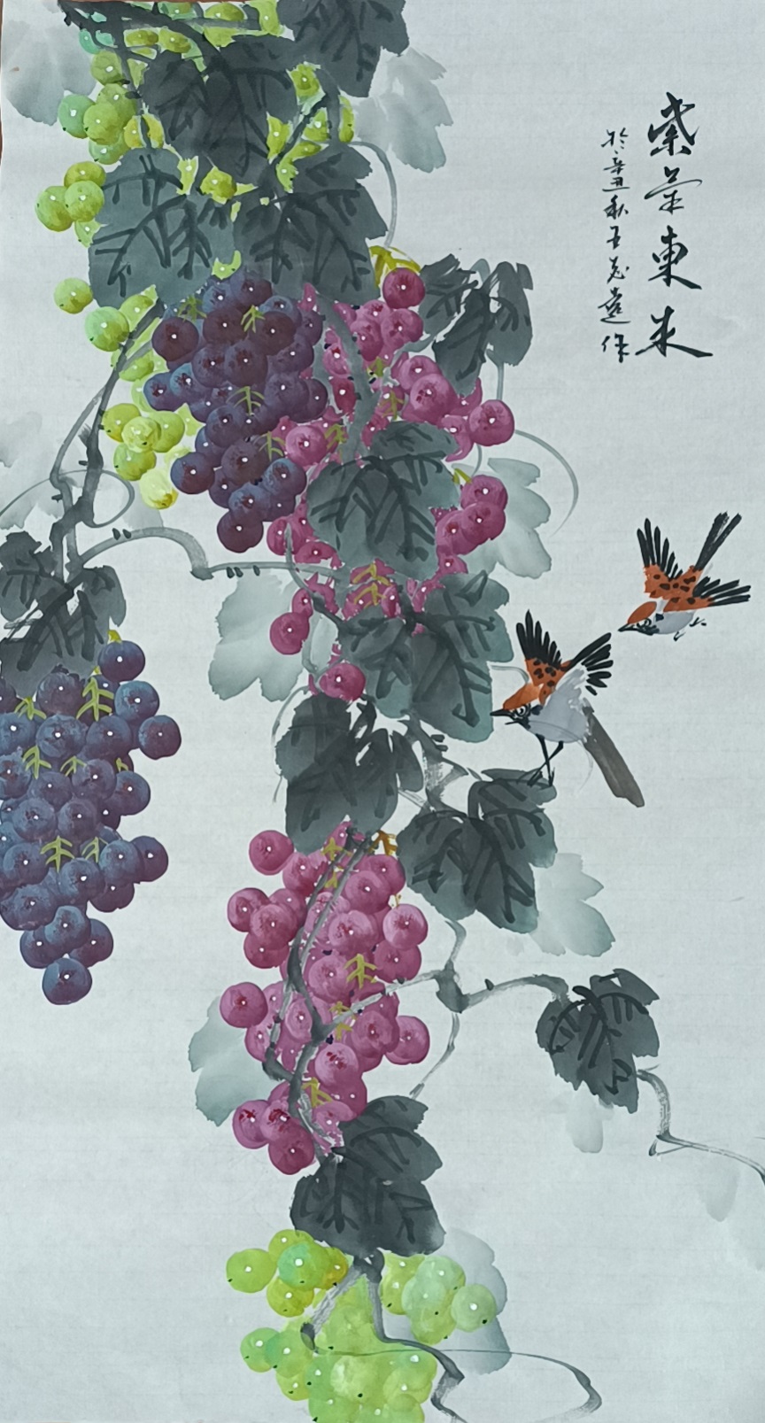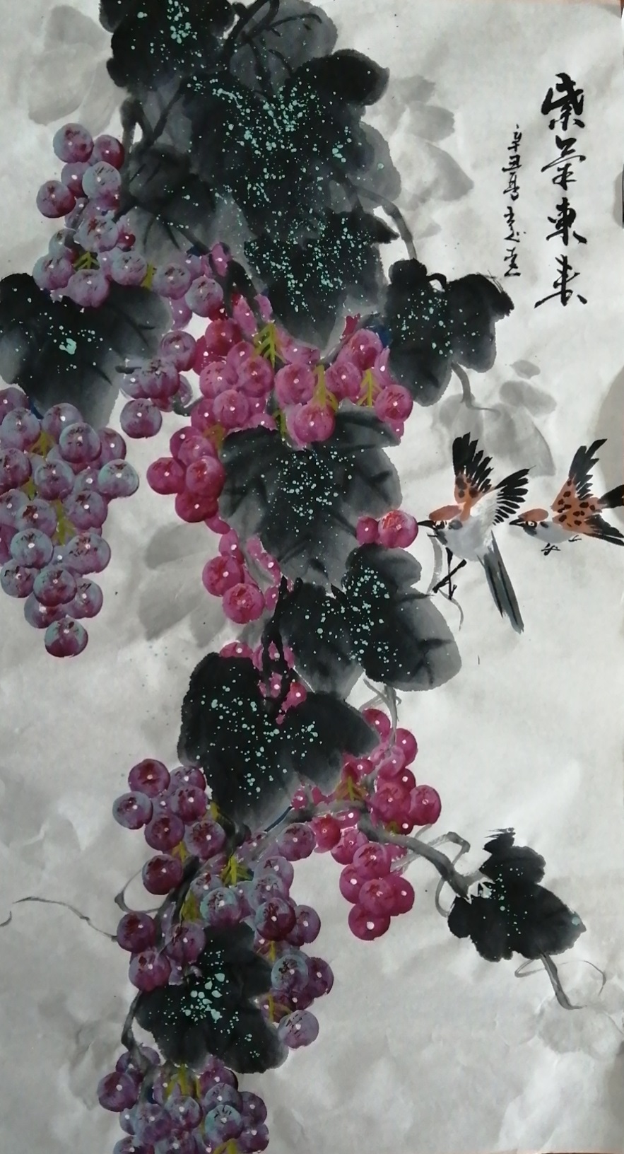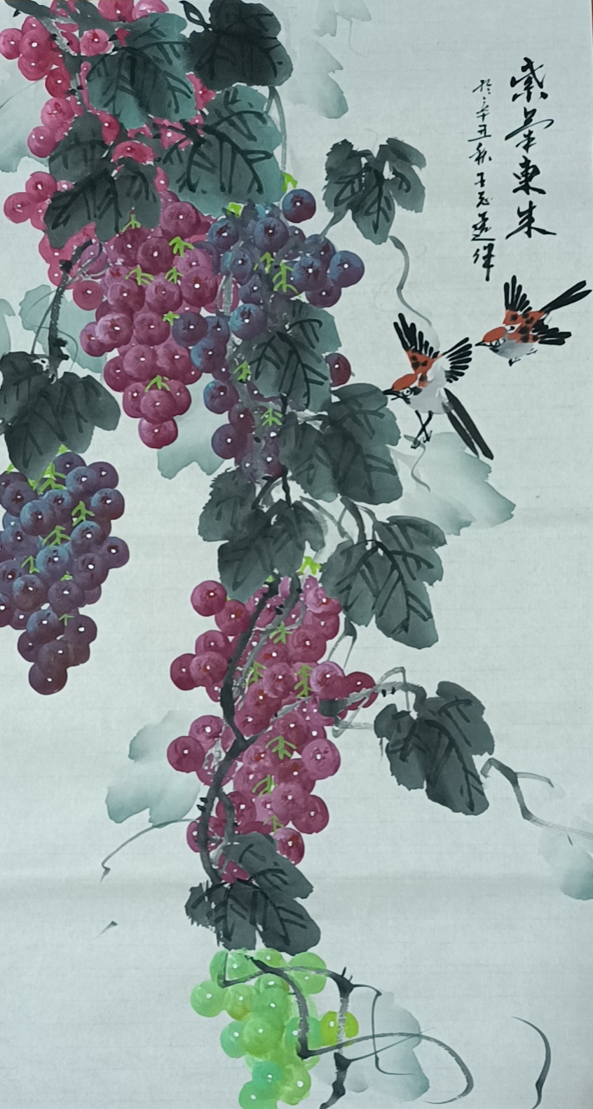 在紫葡丹青中,王志远先生是构建出了自己的笔墨程式和图式,其画中的笔墨是既没有大写意般的草草逸气,同时也没有工笔画那般的精致细腻,画中唯见一股工笔和写意相结合的肌理语境!不仅如此,为了兼顾到所绘物象的形态结构和势态变化,王志远先生还能对笔墨的工性和意性进行适当的创作倾斜,时而以工代意,时而以意代工!画中紫葡,继有传统画法的严谨画功,但又不失于王志远先生自己的绝佳妙韵,颗颗葡粒,饱满剔透,莹光闪烁,所挂枝叶更是鲜嫩灵动,自然清新,整个的枝干藤蔓亦是犹似虬龙苍卷,遒健枯寂!可以说,王志远先生所创作的这些紫葡丹青,画中不但具有非凡的生动视觉和鲜活质感,更是流露出了一股极为丰富的自然意味和气韵!格调超群,赏心悦目!