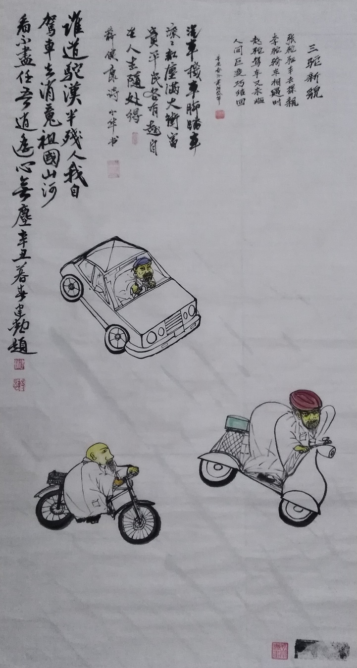 正是因为他为自己的诸科多目的绘画作品,都嵌入了画以抒情、画有哲思的灵感,所以他的画很耐于品味,越看越有味道,常常就有忽然可以叩开心门的妙趣,带有心有灵犀的魅力!比如他画的一件《谁说驼汉半残人》这件作品,这是一个别人都不曾经触及的角度,但是他却关注到了,并且表现出来,把常人眼中的悲情感给化解掉了,改以乐观自信的新体验,画出了积极向上的新表达。这不能不说章小华画画有心意、有新意。凡是环境一角、生活一段、现实一悟,都被他用画笔关联进画里,成为带着趣味意识探讨人生哲学的情景。从不板起面孔画丹青,常用趣味动人心。