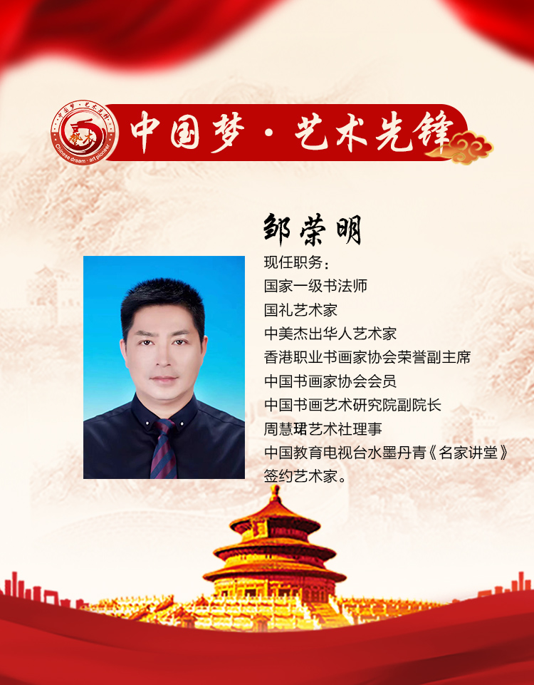 邹荣明,江苏常州人,国家一级书法师,国礼艺术家、中美杰出华人艺术家,香港职业书画家协会荣誉副主席,中国书画家协会会员,中国书画艺术研究院副院长,周慧珺艺术社理事,中国教育电视台水墨丹青《名家讲堂》签约艺术家。