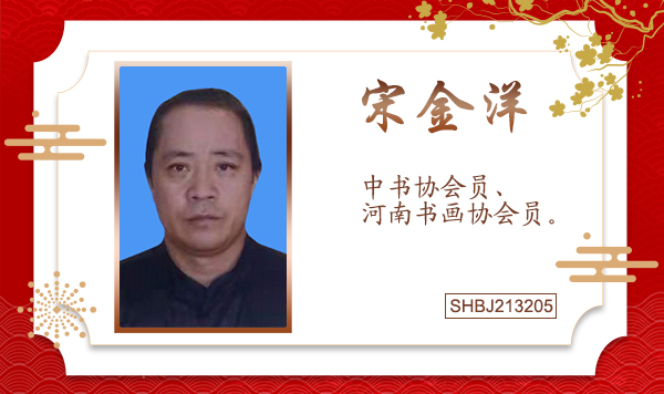 宋金洋濮阳县人,毕业于焦作艺术学院美术系舞美专科。擅长图画,油画、水彩,山水花鸟、人物服装设计、装潢设计、十国油画。自学中国画几十载,擅长图画,油画、水彩,山水花鸟、人物服装设计、装潢设计、十国油画,已形成自己的绘画风格,独创一派,平时除观察真虎外还经常潜计其他大师们的绘画技法。学习、研究、探讨其他的绘画技法,从中得到极大效益。现为:中书协会员、河南书画协会员。