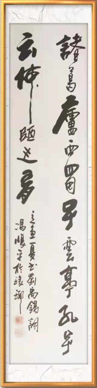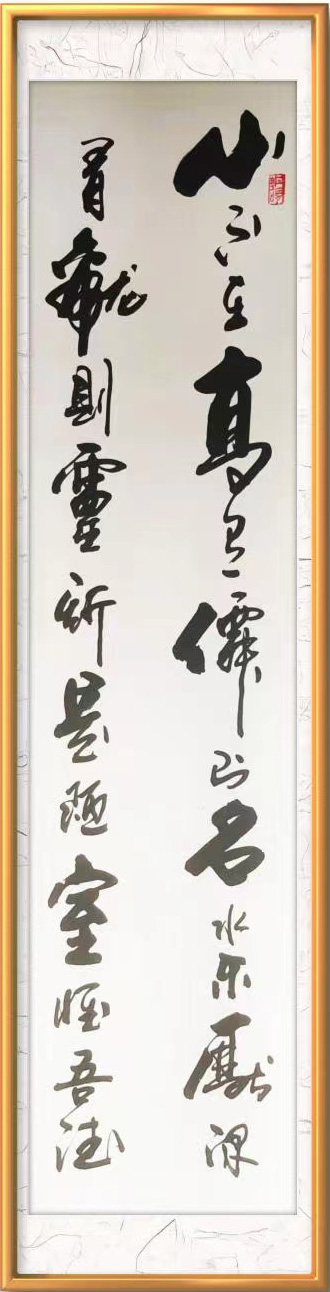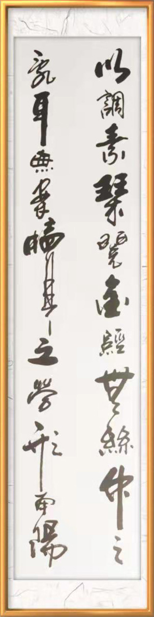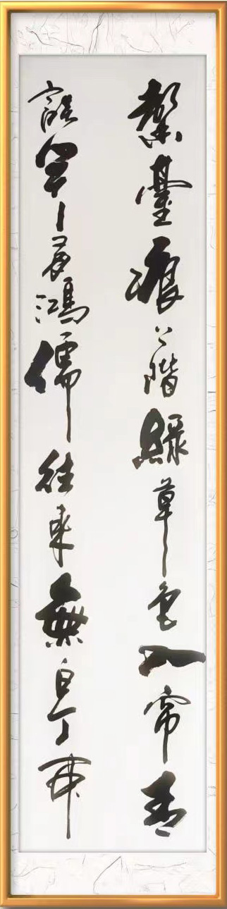 走进他的翰墨世界,可以一览五体兼优的卓越成就,行草创作,则非常鲜明地表达了其书法毫无匠气,纵情挥洒,意在笔先!他以二王法帖为核心,经由心追手临,在帖字的气韵里,还融合进碑字的刚劲,是一位碑入行草的智者,可以把行草写得刚柔相济,完全符合道的精神,也谙证了东方审美“和”的原则。一笔飞纵,如惊雷驰电,可令满座皆惊看不及。一笔铰转,写落花飞雪,可以纤锋往来山水风吟。他非常精确地控制着笔墨和速度感于节奏感,执笔可以写书法线条类万物之象,左蹙右盼如惊电,状如楚汉相攻战!其篆书取法石鼓,重点强调饱满圆厚!有圆笔的融融风度,也有方笔的苍劲浩莽气质,以刚为体,以柔为芯,写得风骨与风度并存,极有中锋行笔的精气神,可以写叩击山河的金石品。