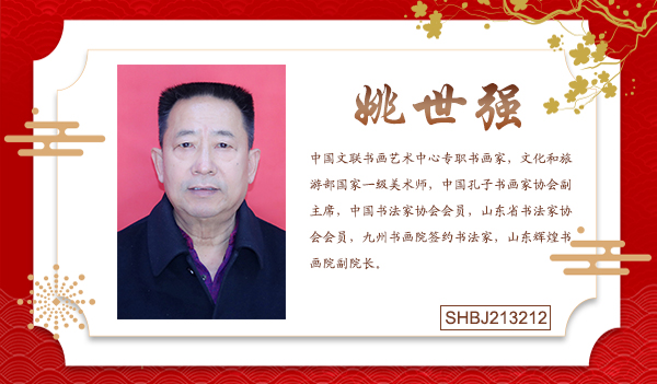 姚世强,男,1955年出生,山东济南人,汉族。自幼酷爱书画艺术,书、画双修,在部队期间任文化教员,苦研书法艺术,以篆书,隶书为主,楷、行草、隶、篆、各体俱佳,师从陈梗桥,张业法、顾亚龙、张弩、张仲亭、耿斌、王长水等名家。国画师从刘玉泉、刘宗亭等大家。九三年毕业于山东艺术学院书法专业,从二王学习行书,篆书苦读秦汉诸家名帖,隶书以汉隶为主。楷书学习欧阳询,逐步形成了自己豪放、严谨的艺术风格。现为中国文联书画艺术中心专职书画家,文化和旅游部国家一级美术师,中国孔子书画家协会副主席,中国书法家协会会员,山东省书法家协会会员,九州书画院签约书法家,山东辉煌书画院副院长。2013年作品通过文化部艺术服务中心Ⅰso2000艺术品评审价书法15000元人民币/平尺。其作品多次参加国际及省市书画大展并获奖,其代表作“室雅兰香”、“厚德载物”、“学无止境”、“天道酬勤”,2016年书法作品被国宾礼特供艺术家评审委员会授予姚世强中国国礼特供艺术资质。同年损赠人民大会堂的书法作品《沁园春雪》被人民大会堂管理局收藏。2017年获得中日韩国际大赛金奖和银奖,部分作品被美国、英国、日本、韩国及国际友人艺术团体收藏。2019年纪念孔子诞辰国际书画大展荣获金奖。