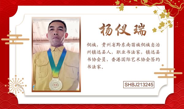 杨仪瑞,男,侗族,贵州省黔东南苗族侗族自治州镇远县人,职业书法家,镇远县书协会员,香港国际艺术协会签约书法家。1966年生,学历,高中,余因家贫而辍学,早早离开校门,务农以求温饱,然追求学识之心更加强烈,自学自研从不敢荒废。尤对书法颇为喜爱,几十年对书法修习从不感厌倦,《专攻颜楷》又为传承古文化而尽一份心力。每年都要为乡亲们义写春联,地方上红白喜事皆乐于应酬。