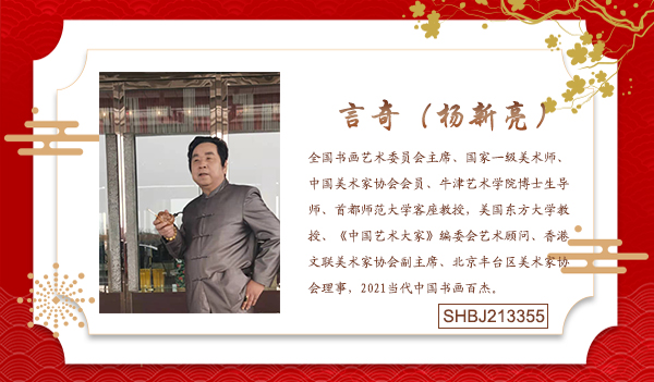 言奇(杨新亮)1958年生于山东潍坊,结业于北京清华大学。著名国礼画家、国学大师,现为全国书画艺术委员会主席、国家一级美术师、中国美术家协会会员、牛津艺术学院博士生导师、首都师范大学客座教授,美国东方大学教授、《中国艺术大家》编委会艺术顾问、香港文联美术家协会副主席、北京丰台区美术家协会理事,2021当代中国书画百杰。言奇在国内艺术界和易学界均做出了重大贡献,成为国际知名画家和国学大师。其作品在全国多次名家书画展获优、银、金奖,并被央视及各大媒体访谈及报道。由天津美术出版《中国艺术大家》专辑,香港文联出版言奇、何家英、刘文西三人专辑,言奇并与山东美协主席张志民、中央美院宋涤教授同届展览,言奇在国内外举办了三十余次作品展,在2017年在国家画院举办了个人画展,言奇作品被文化部遗产文化保护研究院,中国国家博物馆及部分外国元首收藏,《武当山全图》被中国美术馆收藏。2018年,文联“一带一路传世国瓷”大型瓷器创作活动中被中国文联中外名人文化研究会授予2019中国当代艺术巨匠称号。作品《黄河》2018年1月22日获中国八达岭长城组委会、中国长城金奖,入选八达岭长城——新长城文化保护景观区(新长城被国务院命名为一级文化保护景观区)镌刻黄河作品及个人简介,向世人永久展示。