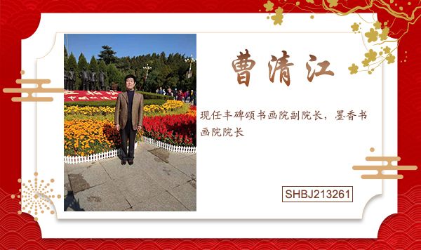 1988年至1990年在再深造学习,授课老师全国书协顾问欧阳中石先生,中国书法家协会会员熊基权先生,张贵银先生,尹墨先生,李松先生。通过学习,受益匪浅。曹清江先生先后临摹过欧阳询、赵孟覜的楷书、王羲之的《兰亭序》、《圣教序》,孙过庭的《书谱》。书法作品曾在河北省书法大赛中多次获奖,报纸刊物刊登多次,其作品极具收藏价值。