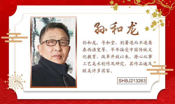 孙和龙,号和堂,别署退而不退斋泰西渔叟等。孙和龙1956年生于山东泰安市东平县。早年接受中国传统文化教育,改革开放以来,潜心从事工艺美术创作及研究,其作品遍及欧美许多国家。孙和龙先生60岁后,自署“退而不退斋”,敢于创新,又开中西绘画探索之新风。其作品中或轻描淡写,或浓墨重彩,看似无法却有法。每每摹古临贴,无不竭力用心。四十年如一日,苍笔不辍。近年来,常见画于世,佳作意味不穷,其作品渐渐成为诸多朋友的追藏。