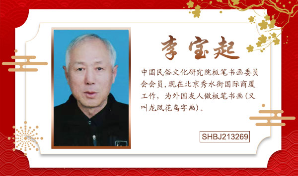 李宝起,中国民俗文化研究院板笔书画委员会会员,本人从事板笔书画三十多年,其作品深受国人和外国朋友的喜爱和收藏,曾多次参加大型板笔书画交流活动,先后去过全国十多个省市及中国大饭店维也纳国际酒店等年会活动