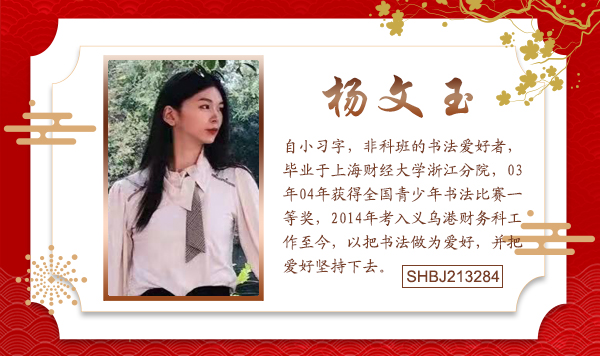 自小习字,非科班的书法爱好者,毕业于上海财经大学浙江分院,03年04年获得全国青少年书法比赛一等奖,20l4年考入义乌港财务科工作至今,以把书法做为爱好,并把爱好坚持下去。