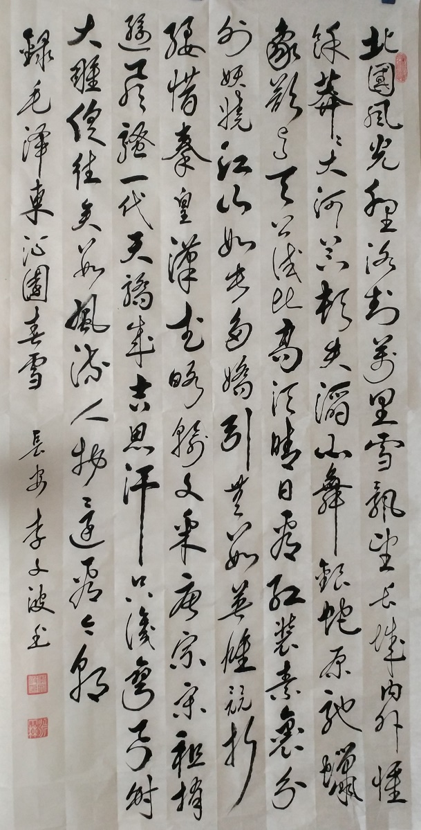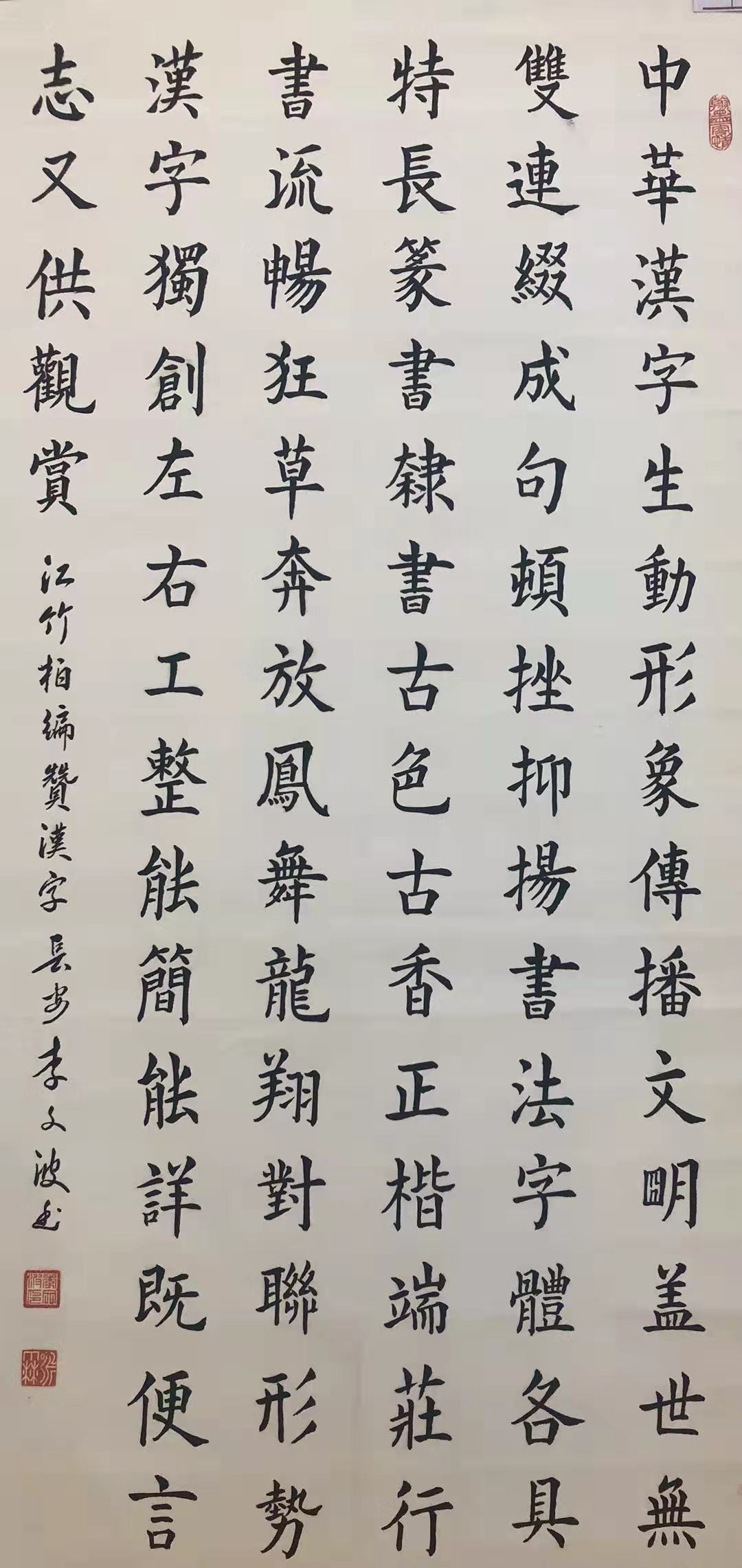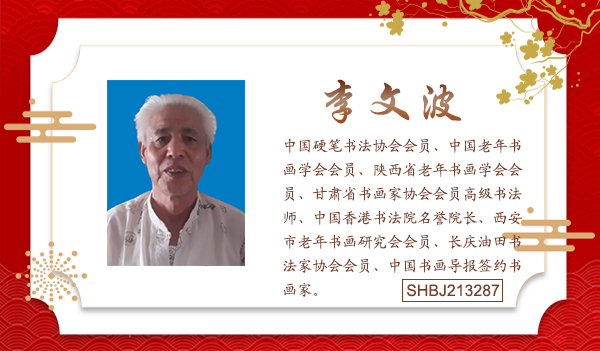 李文波,字昶霖,男,汉族,1948年12月出生,甘肃镇原人,中共党员,长庆油田退休。中国硬笔书法协会会员、中国老年书画学会会员、陕西省老年书画学会会员、甘肃省书画家协会会员高级书法师、中国香港书法院名誉院长、西安市老年书画研究会会员、长庆油田书法家协会会员、中国书画导报签约书画家。作品在国内外书法大赛中多次获得金、银、铜奖,先后入编《世界名人录》《中国老年书画学会会员精品集》《翰墨颂伟人》《喜迎十八大·中国书画艺术精品珍藏大典》《甘肃当代书画家艺术典库》等典集。获“第七届全国书法艺术行列全国500强”“中华国粹·图腾奖”“百名中国书画名家”等荣誉称号。获2017年长庆油田“点赞新变化,喜迎十九大”书画展三等奖、2018年“一带一路”书画艺术大赛二等奖、2019年中·泰国际 “联盟杯”书画作品金奖。