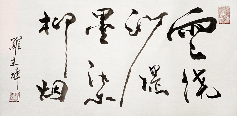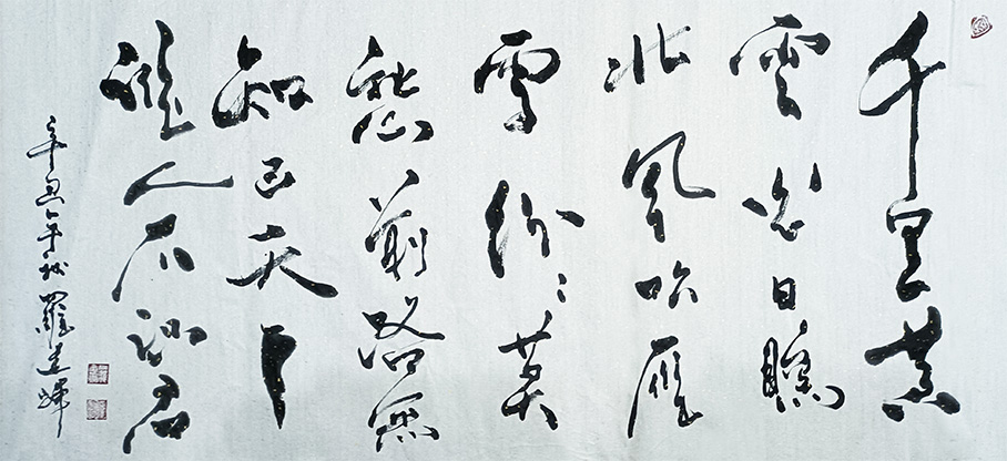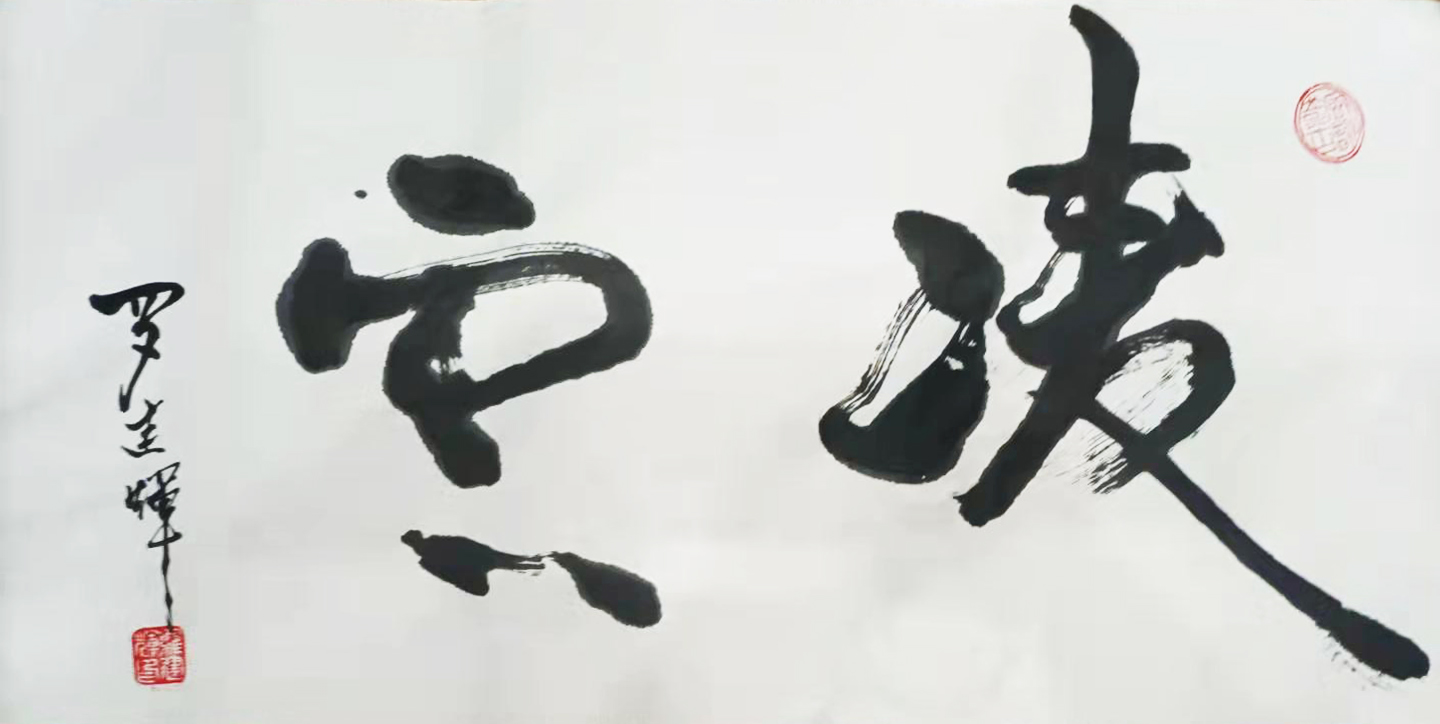 在传统的名家碑帖中读取精髓,在个人的艺术思考中提升意境,这是每一位翰墨艺术家都不应避开的发展正道!倘若盲目求新,擅自摒古,那么经由此所创作出的翰墨作品,即使尚有三分气韵,也终究是不能避免造作之嫌!而作为当下书坛界内的前沿性人物,罗建辉先生自是深谙于此道,所以我们看他的众幅书法作品,也无一不是有古迹可循之,有古韵可察之!就以先生的众幅行草书法来看,其作中笔致,可见行运之变幻,亦可见顿挫之节律,那俊健的笔墨锋毫,正是完美的诠释了什么叫变化莫测,什么叫阵马风樯!而罗建辉先生的行草书法之所以耐品耐看,除了笔墨的高度技法之外,还在于整体篇章的大家气象!其作中行草,字字已堪动人心魄,通体字法更是素有势来不可止,势去不可遏之境!是谓功法至高,尽谱华章!
