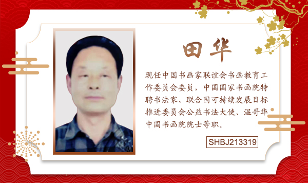 田华,1989年7月中国书画函授大学毕业,师从欧阳中石。现为中国书画家联谊会书画教育工作委员会委员,中国国家书画院特聘书法家、联合国可持续发展目标推进委员会公益书法大使、温哥华中国书画院院士、中国硬笔书法家协会会员、CETV水墨丹青书画院会员,山东省老干部书画研究会会员、北京华夏诗联书画院助理研究员、临沂市、区书法家协会会员,国家一级美术师,建党百年授予全国艺术楷模,入编书画师资数据库。